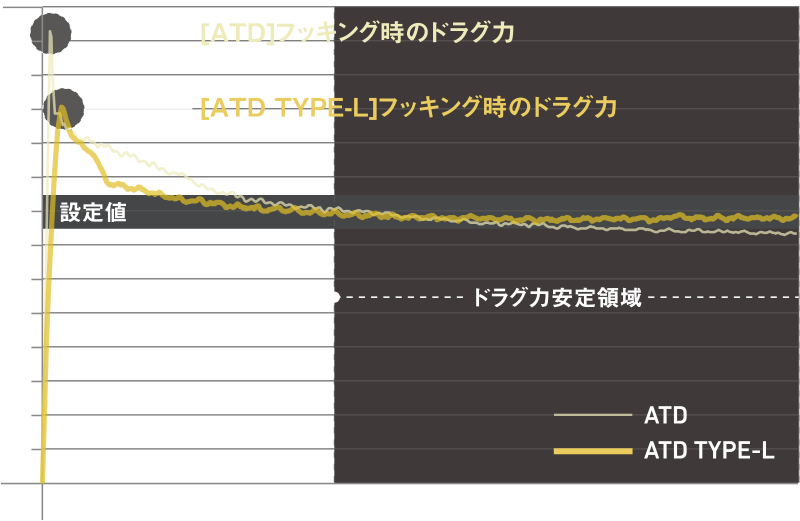 与ATD作比较,TYPE-L的整体特性与ATD相似,但TYPE-L有一个设置,可以在鱼上钩或其他突然被鱼拉扯钓线的时候减少泄力值的增加。这使得它更能适应现代的钓鱼方法和钓具设置,并减少了搭配轻型鱼线时因鱼类的应激反应而造成的断线问题。