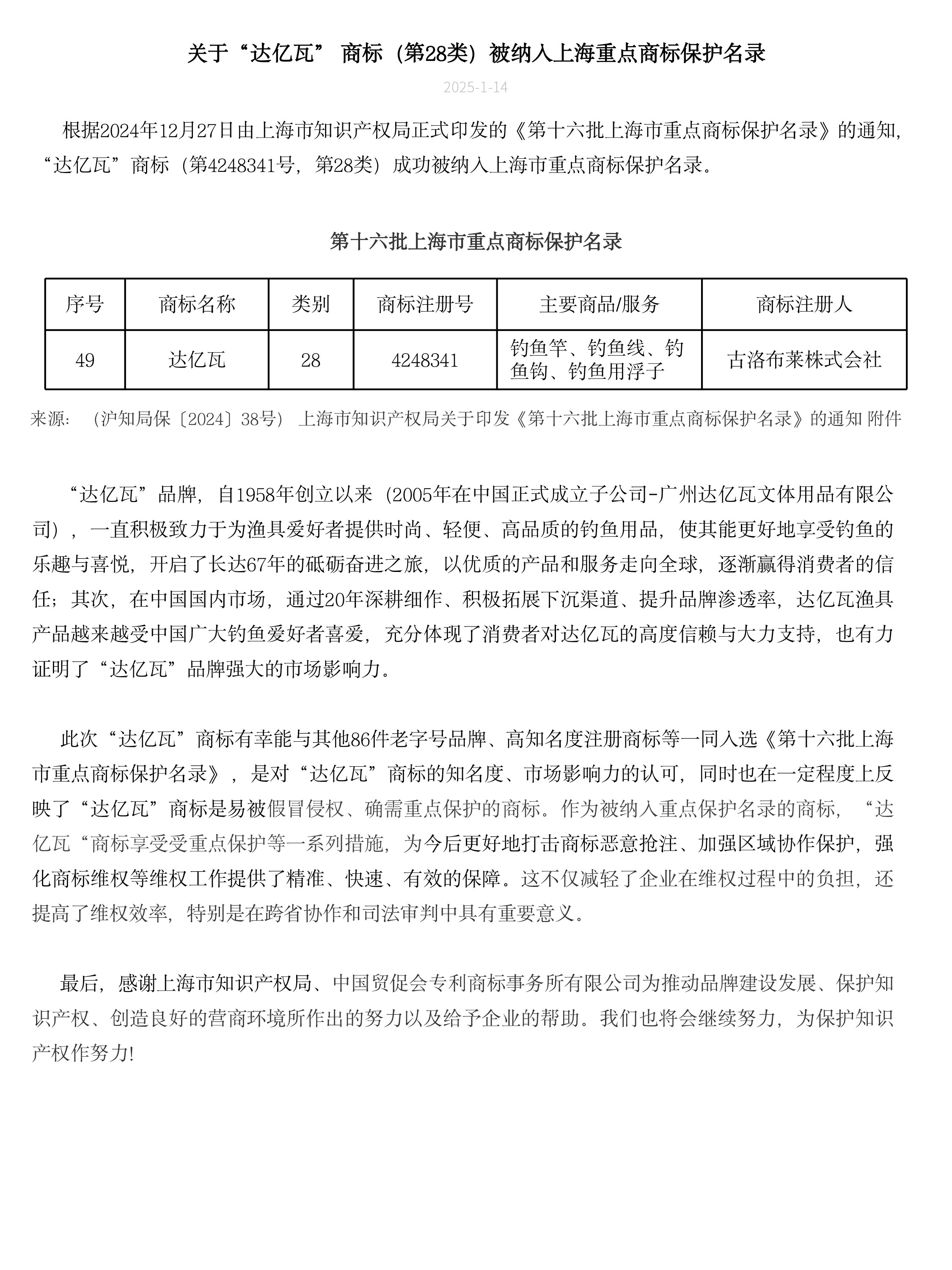 关于“达亿瓦” 商标(第28类)被纳入上海重点商标保护名录