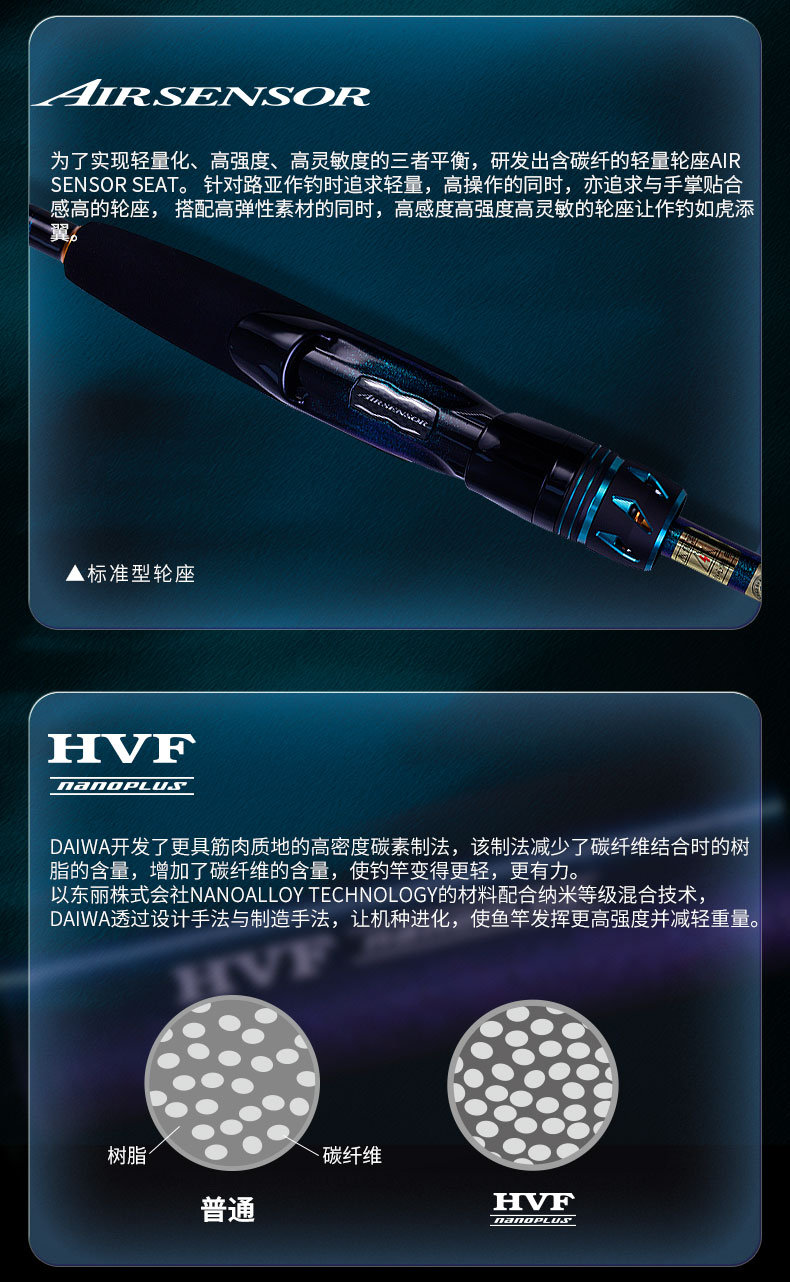 以东丽株式会社 NANOALLOY TECHNOLOGY 的材料,配合纳米等级特殊混合技术,让固定碳纤的数种接着树脂实现高性能、高机化。DAIWA 透过独自的设计手法与制造手法,针对每个机种进行提升,使竿节发挥更高强度并减轻重量。