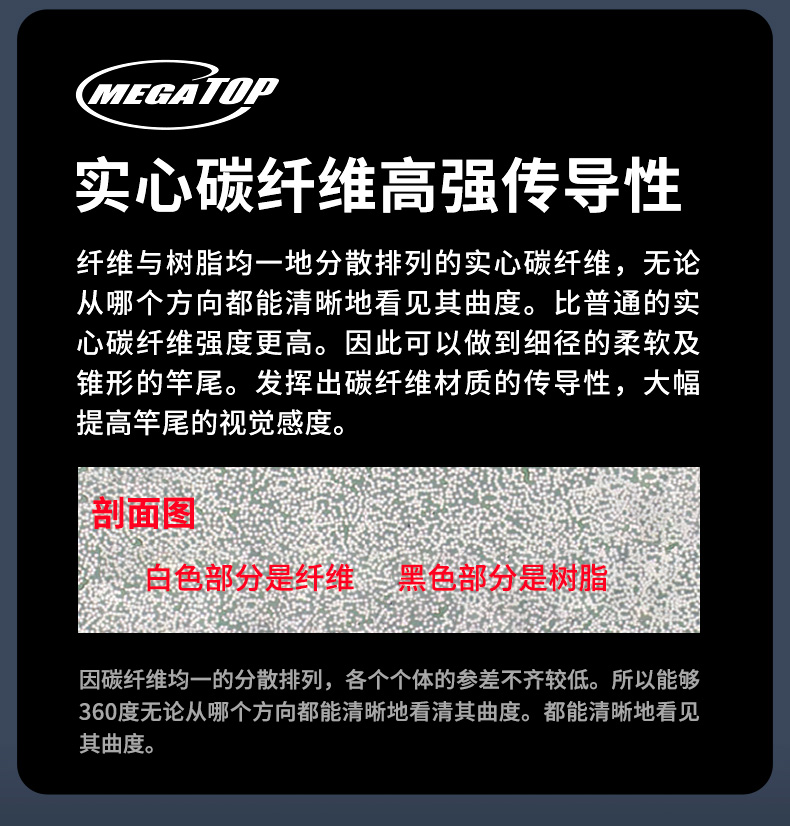 MEGA TOP 是纤维与树脂均一地分散排列的实心碳纤维,无论从哪个方向都能清晰地看见其曲度。比普通的实心碳纤维强度更高。因此可以做到细径的柔软及锥形的竿尾。发挥出碳纤维材质的传导性,大幅提高竿尾的视觉感度。