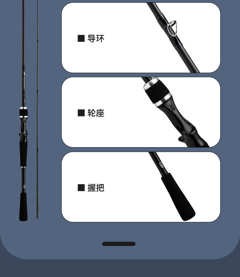 V-JOINT:具线条美感弧度能达到理想的状态及发挥更高威力。在竿节的部位使用DAIWA自身的BIAS构造。实现结合部的理想弧度,同时提高力量/传导/感度性能。 V-JOINTα:使用含nano+的高强度材质及DAIWA自身高精准度钓竿设计制造技术, 使V-JOINT更加强韧、轻盈、美观。