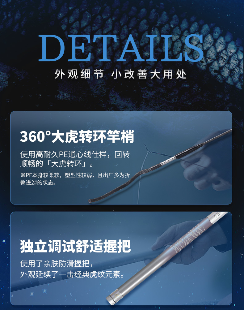 V-JOINT:具线条美感弧度能达到理想的状态及发挥更高威力。在竿节的部位使用DAIWA自身的BIAS构造。实现结合部的理想弧度,同时提高力量/传导/感度性能。 V-JOINTα:使用含nano+的高强度材质及DAIWA自身高精准度钓竿设计制造技术, 使V-JOINT更加强韧、轻盈、美观。
