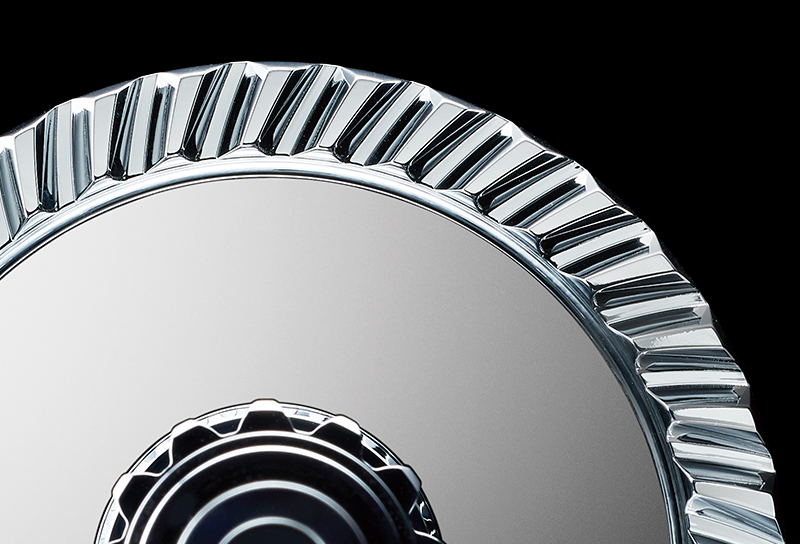 此外,在传统方式中,固定机身的螺丝孔会占据内壁一定的空间。这就使内部可以装载的驱动齿轮的尺寸受限。另一方面,单壳式机身不需要螺丝孔。这意味着机身内部拥有了更多的空间,可以精巧组装各种各样的零件。尽管机身尺寸看起来和以前一样,但现在可以安装比以前更大的驱动齿轮。