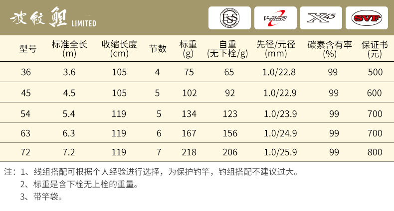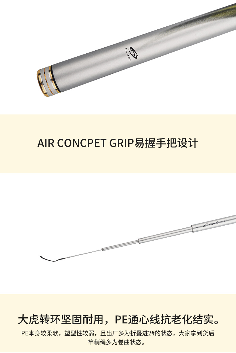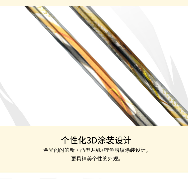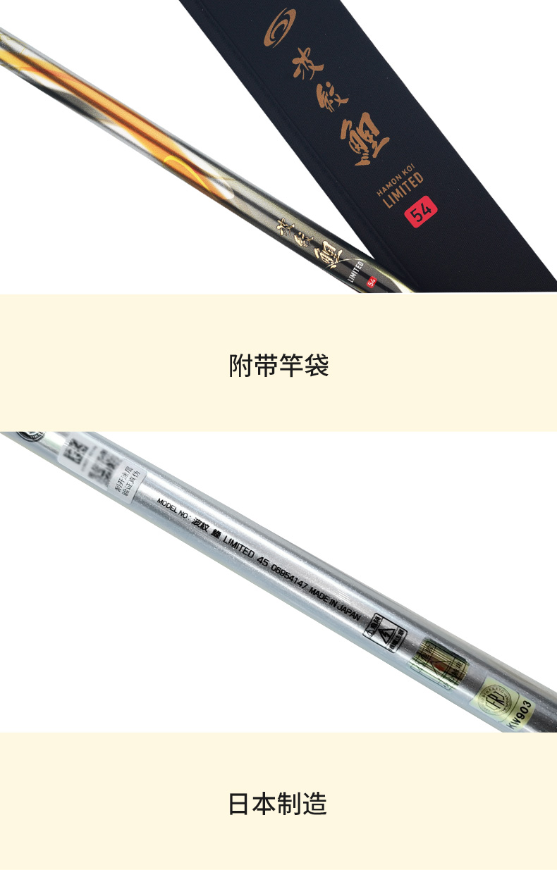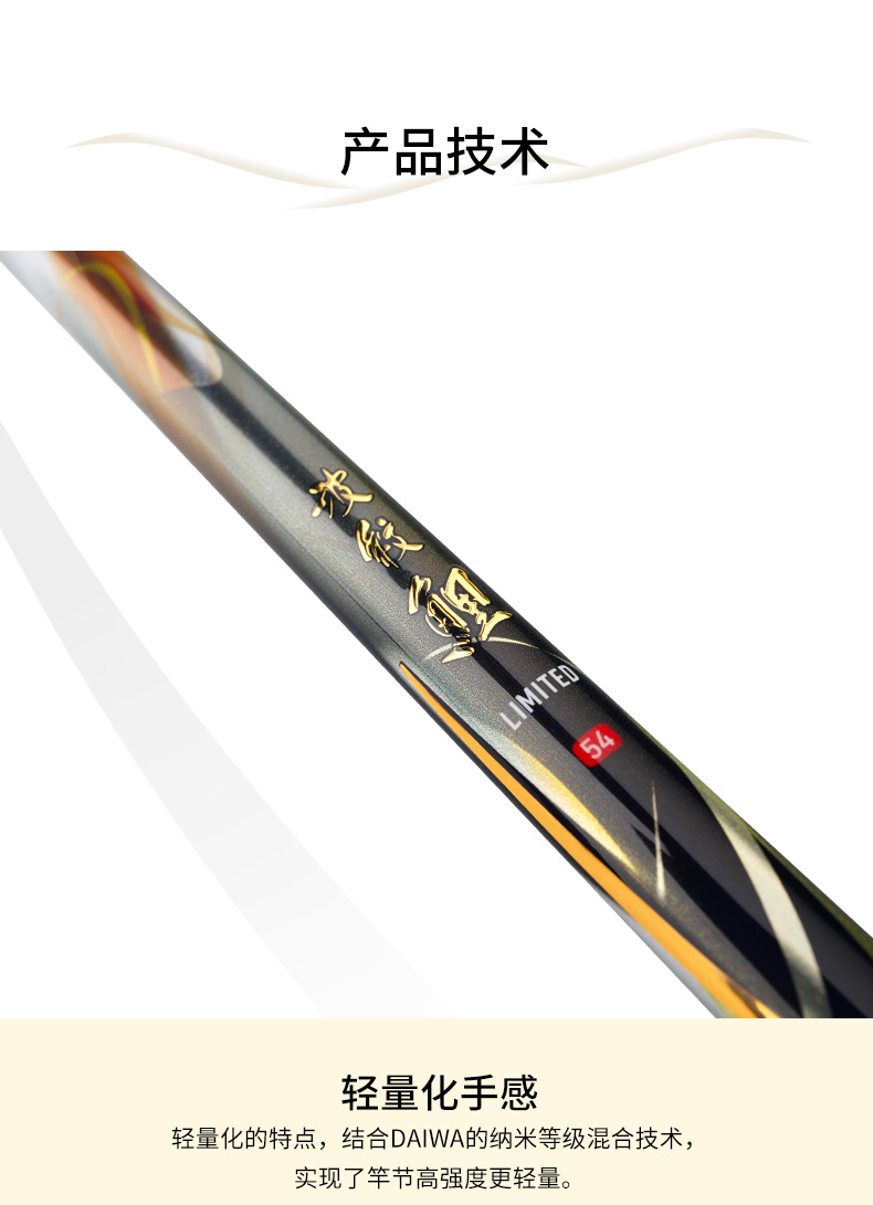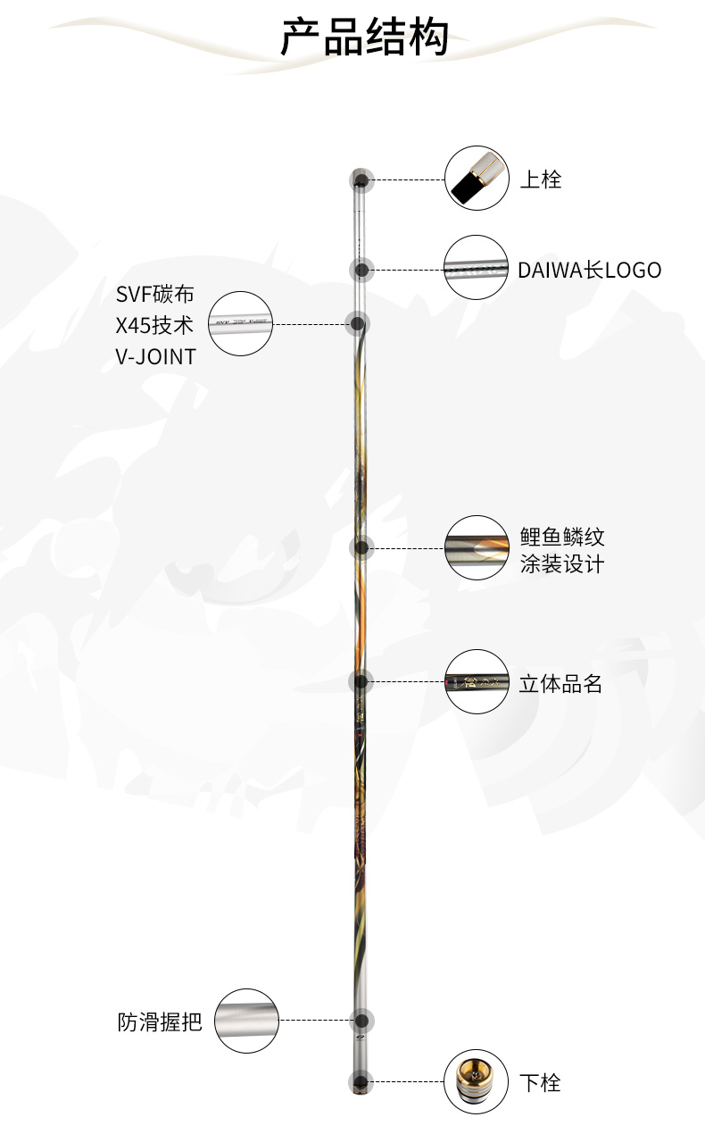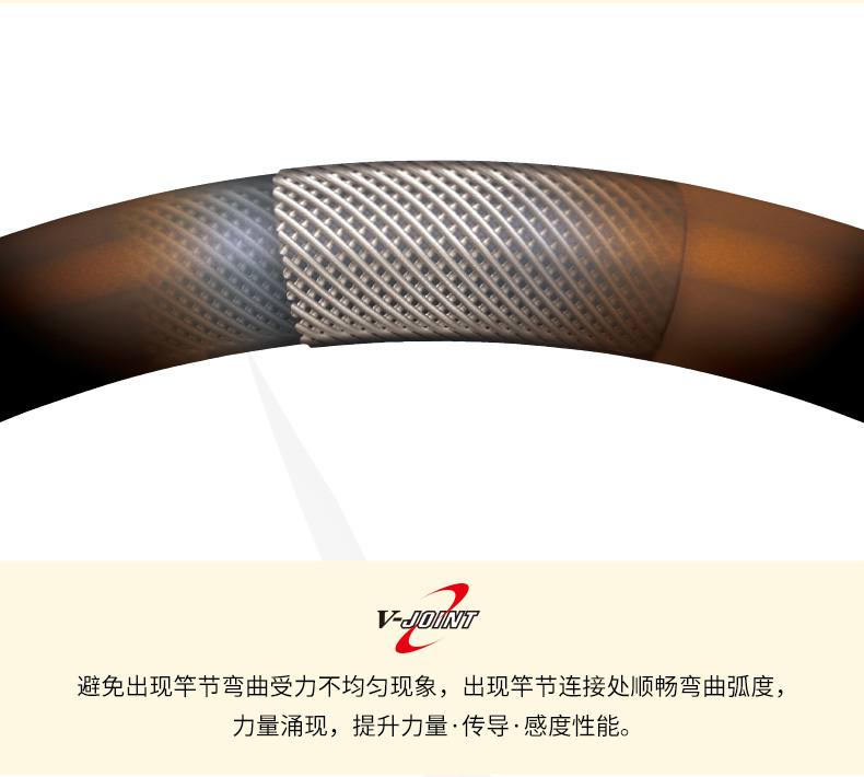 V-JOINT:具线条美感弧度能达到理想的状态及发挥更高威力。在竿节的部位使用DAIWA自身的BIAS构造。实现结合部的理想弧度,同时提高力量/传导/感度性能。 V-JOINTα:使用含nano+的高强度材质及DAIWA自身高精准度钓竿设计制造技术, 使V-JOINT更加强韧、轻盈、美观。