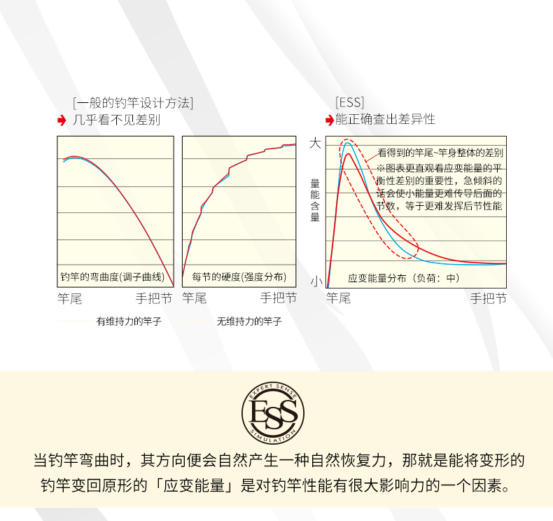 当钓竿弯曲时,其反方向便会自然产生一种自然复元力。那就是能将变形的钓竿变回原形的「应变能量」是对钓竿性能有很大影响力的一个因素.DAIWA开发了能将「应变能量」透彻分析并进行设计的系统。不仅能明确地显示出“那个部分好”“那个部分不足”,还能把感度领域也能在钓竿上显现出来,制作出理想的钓竿,改变性的钓竿“ESS”设计系统。