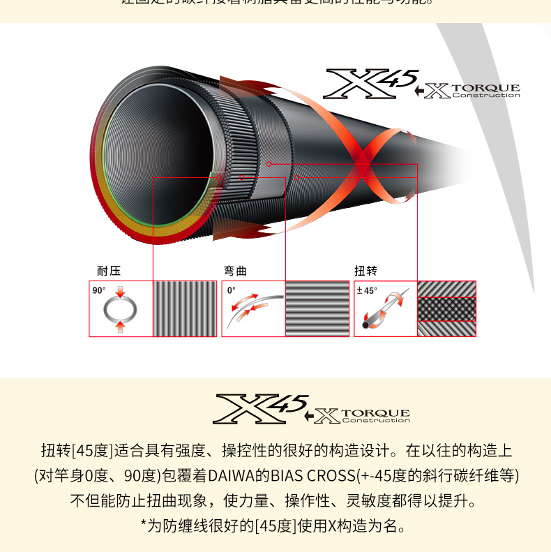 X45:扭转[45°]适合具有强度、操控性的很好的构造设计。在以往的构造上(对竿身0°、90°)包覆着DAIWA的BIAS CROSS(+-45°的斜行碳纤维等)不但能防止扭曲现象,使力量、操作性、灵敏度都得以提升。 X45 FULL SHIELD:针对抛竿、诱鱼、弓鱼、博鱼,X45 FULL SHIELD会排除掉在这些动作和操作中出现的扭曲现象。从容易产生扭曲的素材先端开始,用45°的斜行纤维从能体现效果的外层开始包裹,从而耐扭曲的刚性得到了很大的提升。