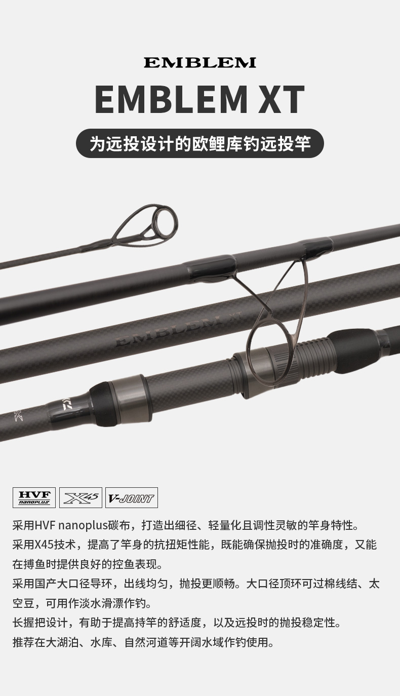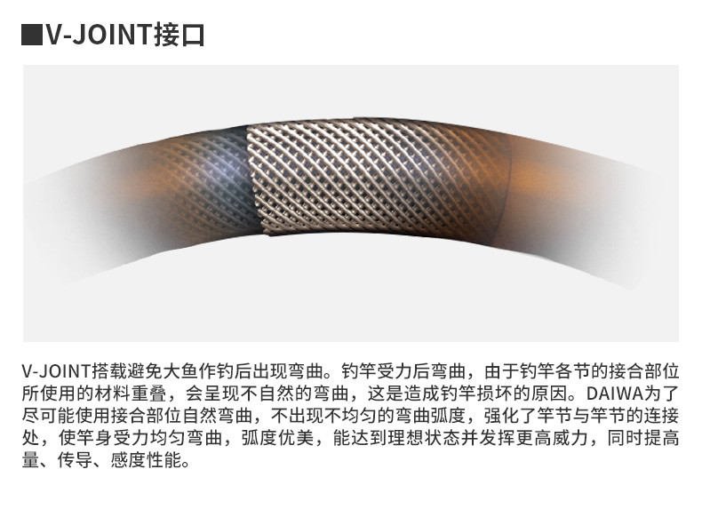 V-JOINT:具线条美感弧度能达到理想的状态及发挥更高威力。在竿节的部位使用DAIWA自身的BIAS构造。实现结合部的理想弧度,同时提高力量/传导/感度性能。 V-JOINTα:使用含nano+的高强度材质及DAIWA自身高精准度钓竿设计制造技术, 使V-JOINT更加强韧、轻盈、美观。