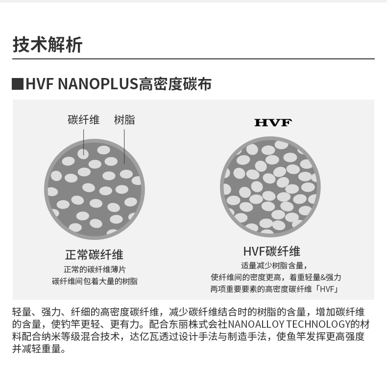 以东丽株式会社 NANOALLOY TECHNOLOGY 的材料,配合纳米等级特殊混合技术,让固定碳纤的数种接着树脂实现高性能、高机化。DAIWA 透过独自的设计手法与制造手法,针对每个机种进行提升,使竿节发挥更高强度并减轻重量。