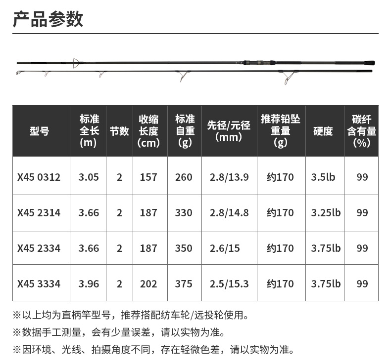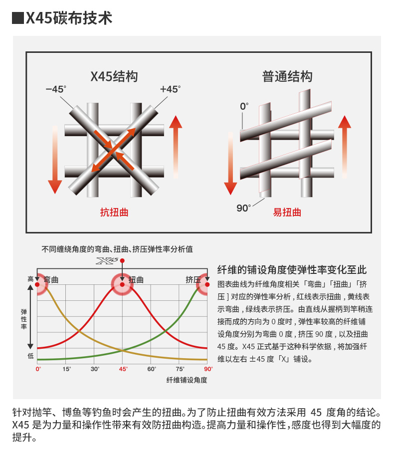 X45:扭转[45°]适合具有强度、操控性的很好的构造设计。在以往的构造上(对竿身0°、90°)包覆着DAIWA的BIAS CROSS(+-45°的斜行碳纤维等)不但能防止扭曲现象,使力量、操作性、灵敏度都得以提升。 X45 FULL SHIELD:针对抛竿、诱鱼、弓鱼、博鱼,X45 FULL SHIELD会排除掉在这些动作和操作中出现的扭曲现象。从容易产生扭曲的素材先端开始,用45°的斜行纤维从能体现效果的外层开始包裹,从而耐扭曲的刚性得到了很大的提升。