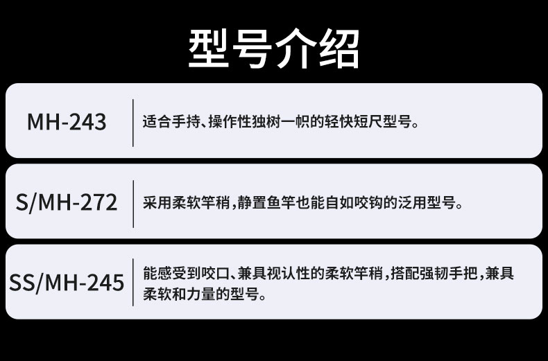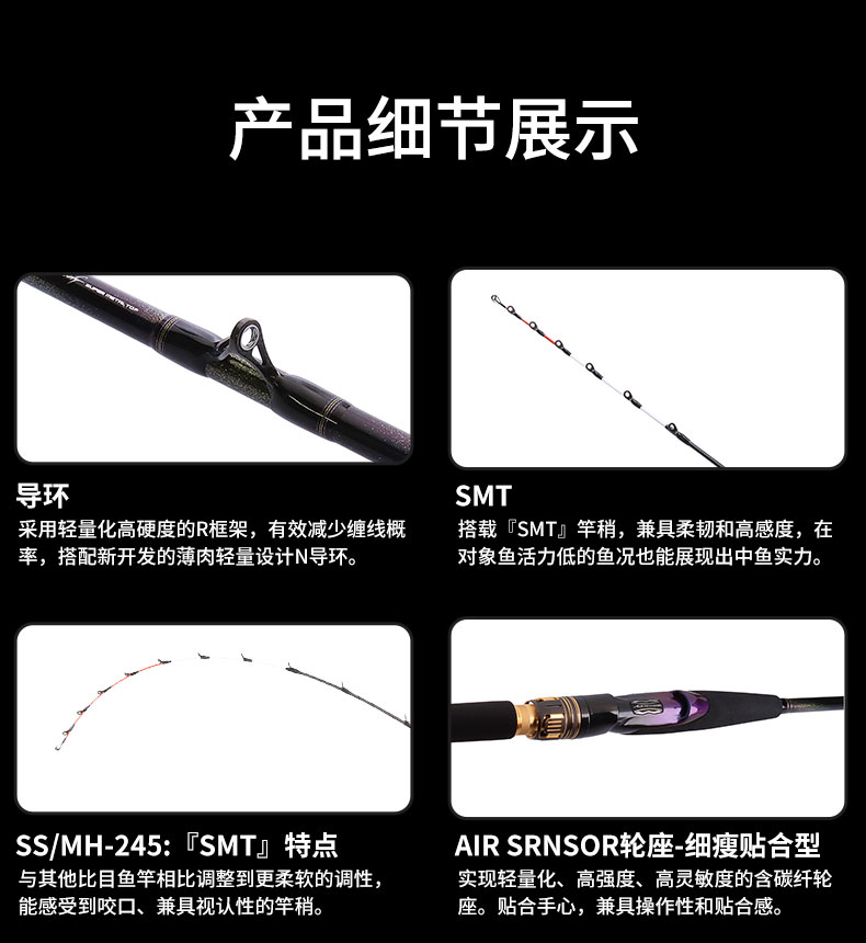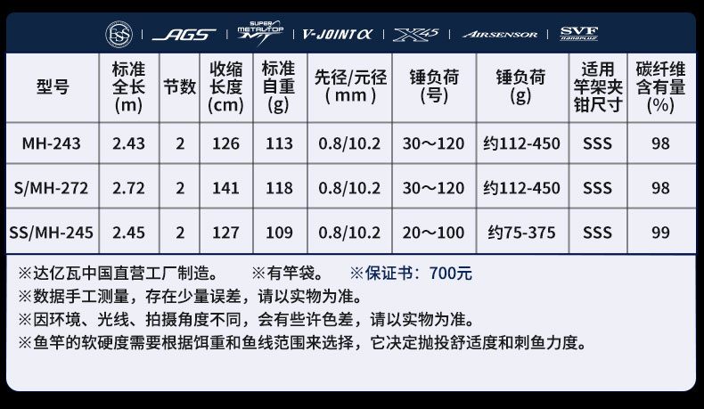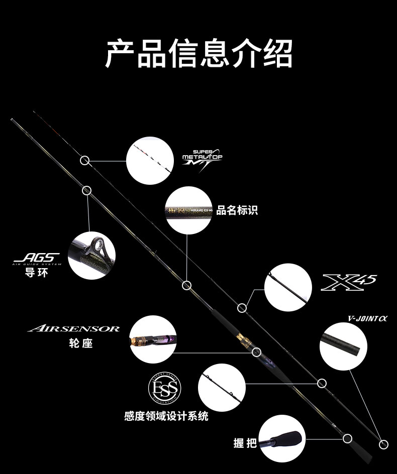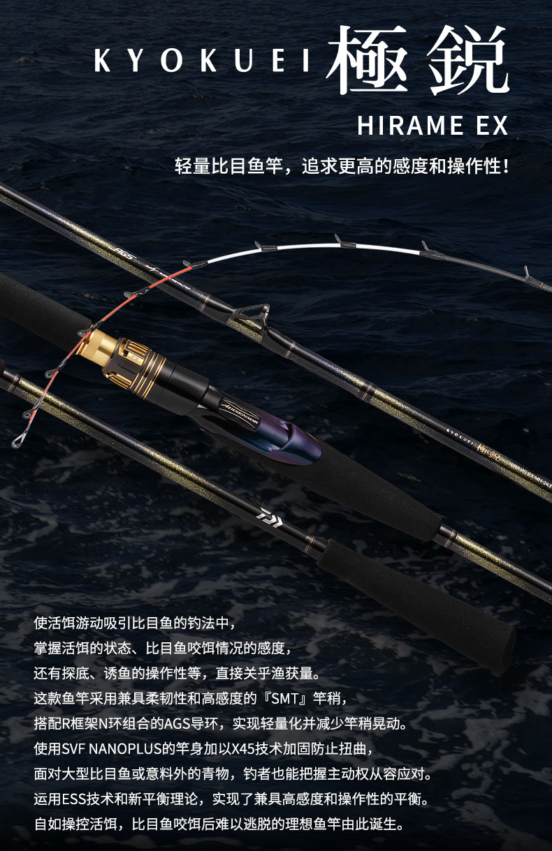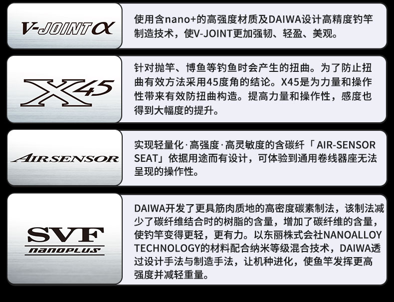 V-JOINT:具线条美感弧度能达到理想的状态及发挥更高威力。在竿节的部位使用DAIWA自身的BIAS构造。实现结合部的理想弧度,同时提高力量/传导/感度性能。 V-JOINTα:使用含nano+的高强度材质及DAIWA自身高精准度钓竿设计制造技术, 使V-JOINT更加强韧、轻盈、美观。