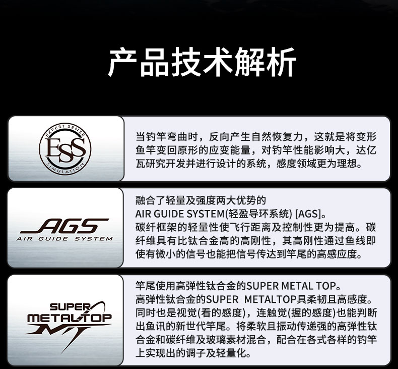 当钓竿弯曲时,其反方向便会自然产生一种自然复元力。那就是能将变形的钓竿变回原形的「应变能量」是对钓竿性能有很大影响力的一个因素.DAIWA开发了能将「应变能量」透彻分析并进行设计的系统。不仅能明确地显示出“那个部分好”“那个部分不足”,还能把感度领域也能在钓竿上显现出来,制作出理想的钓竿,改变性的钓竿“ESS”设计系统。