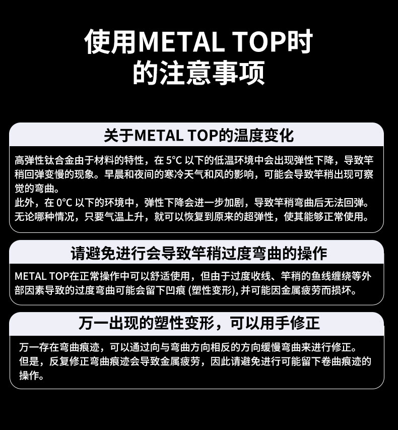 竿尾使用高弹性钛合金的SUPER METAL TOP。高弹性钛合金的SUPER METAL TOP具柔韧且高感度。同时也是视觉(看的感度),连触觉(握的感度),也能判断出鱼讯的新世代竿尾。将柔软且振动传递强的高弹性钛合金和碳纤维及玻璃素材混合,配合在各式各样的钓竿上实现出适合的调子及轻量化。