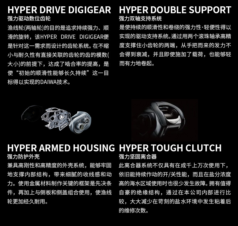 渔线轮(两轴轮)的全新齿轮系统设计,旨在追求持续强力且顺滑的回转。DAIWA独有的技术在不缩小直接影响耐久性的齿轮模数(大小)的前提下,实现啮合率的提高,保障初期的顺滑性能够长久持续。