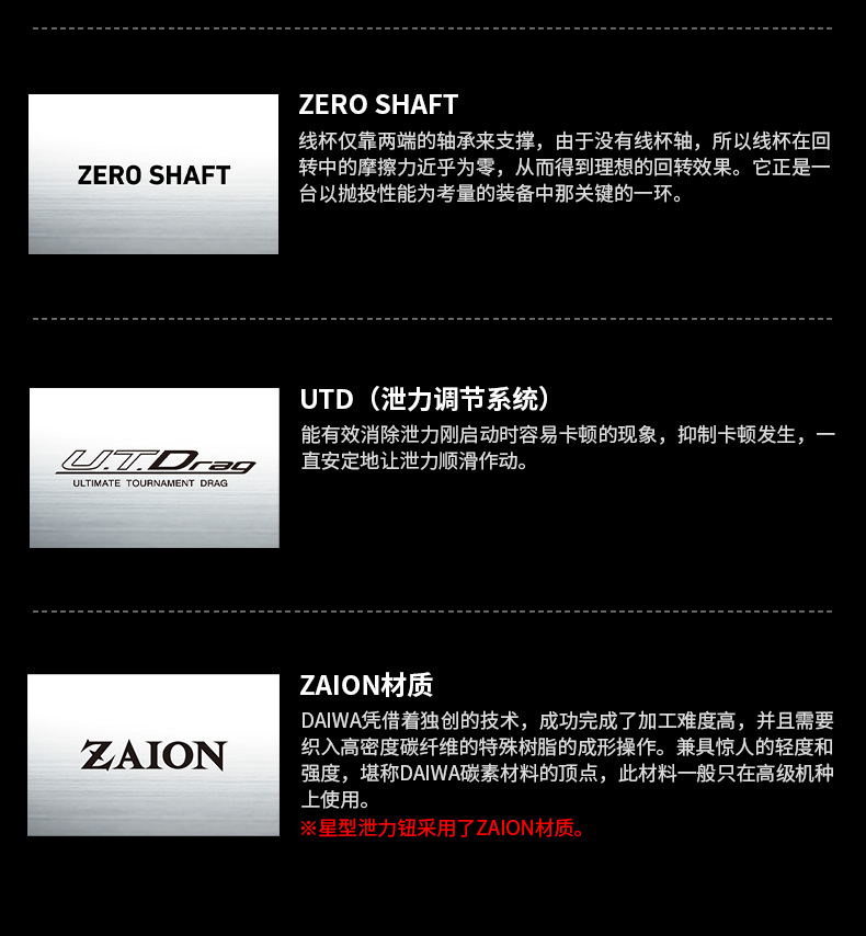 ZAION是一种高密度碳纤维的复合树脂,具有轻、强劲、耐腐蚀的特点。重量与强度的几乎都在镁合金之上,堪称是一种化不可能为可能的材料。常用来制造渔轮的机身、转盘等主要部件,它把“强度”和“轻量”这自相矛盾的两者成功合而为一。