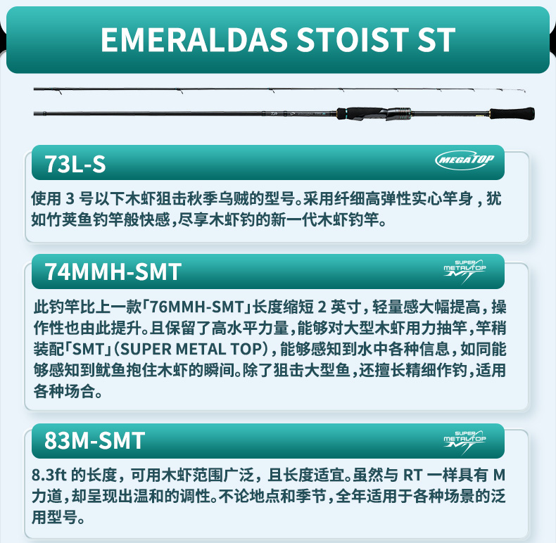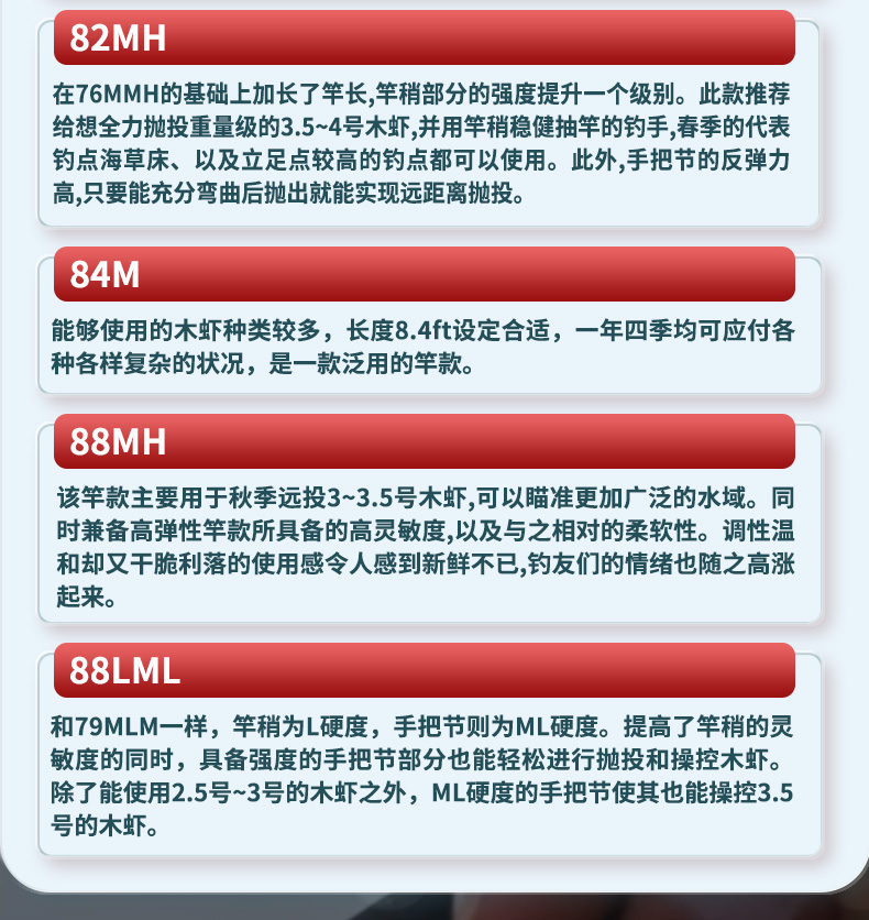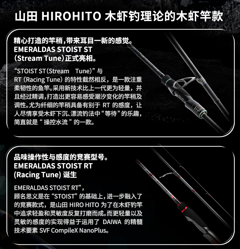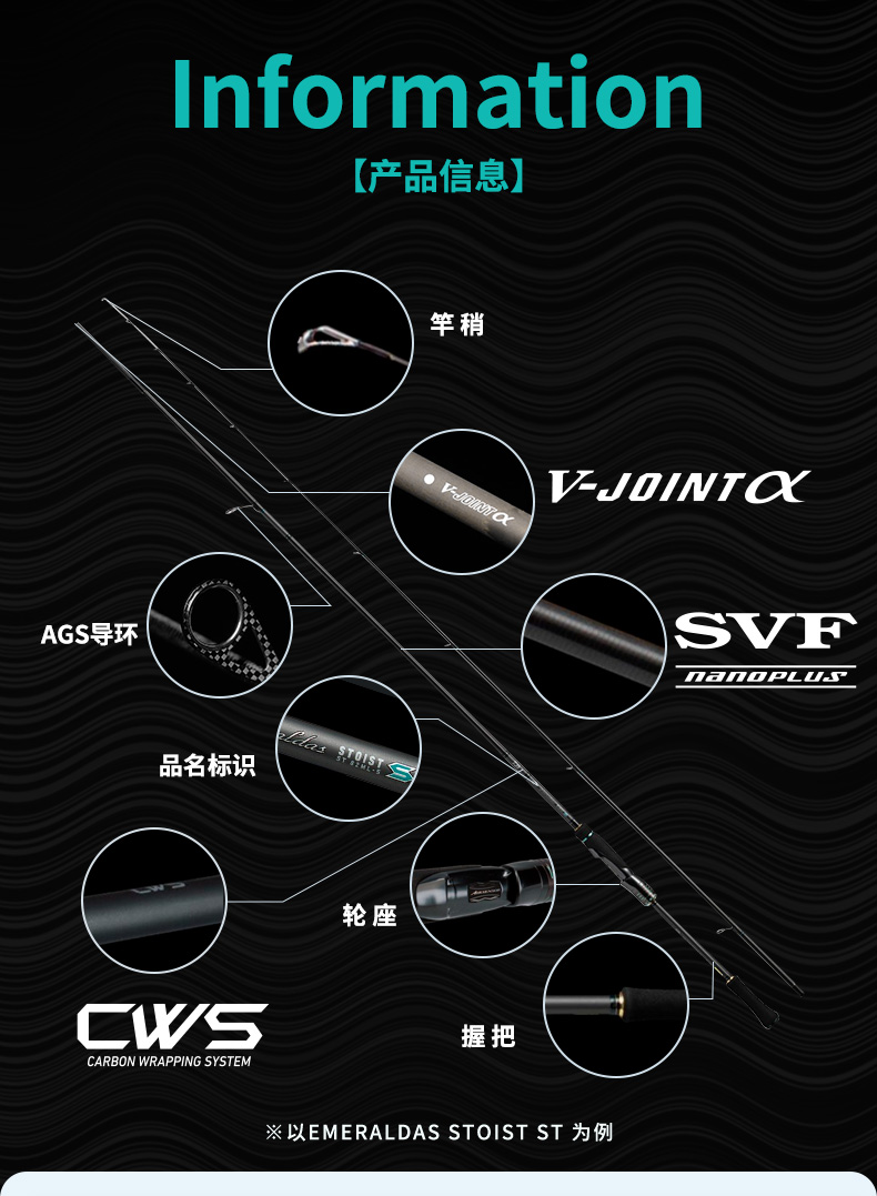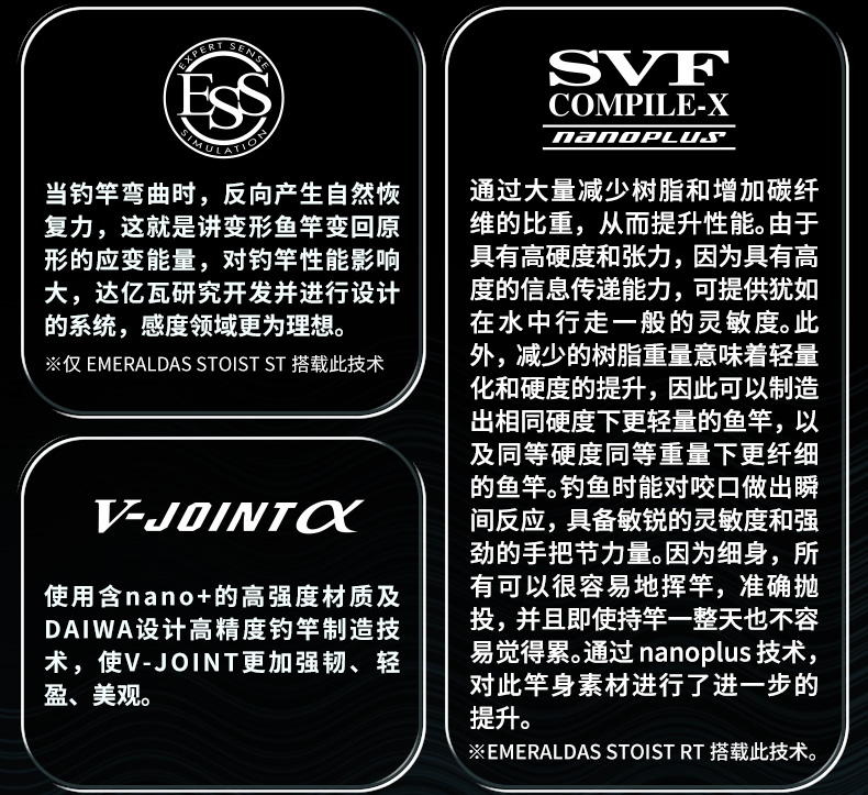 V-JOINT:具线条美感弧度能达到理想的状态及发挥更高威力。在竿节的部位使用DAIWA自身的BIAS构造。实现结合部的理想弧度,同时提高力量/传导/感度性能。 V-JOINTα:使用含nano+的高强度材质及DAIWA自身高精准度钓竿设计制造技术, 使V-JOINT更加强韧、轻盈、美观。