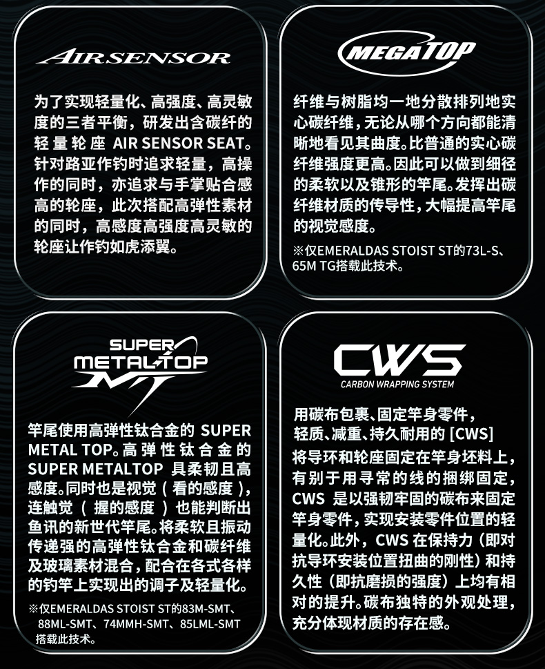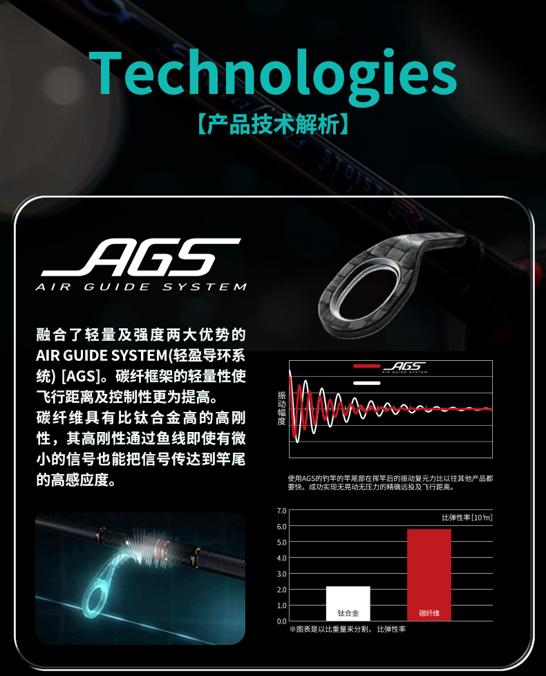 以东丽株式会社NANOALLOY TECHNOLOGY的材料配合奈米等级混合技术,让固定碳纤的数种接着树脂具备更高的性能与更功能。DAIWA透过自身的设计手法与制造手法,针对每个机种进行优化,使竿节发挥更高强度并减轻重量。