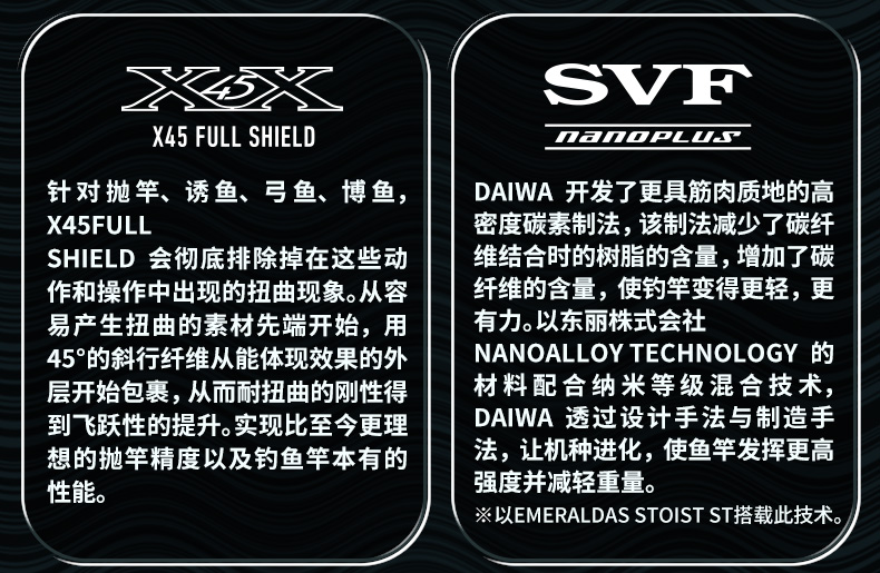 X45:扭转[45°]适合具有强度、操控性的很好的构造设计。在以往的构造上(对竿身0°、90°)包覆着DAIWA的BIAS CROSS(+-45°的斜行碳纤维等)不但能防止扭曲现象,使力量、操作性、灵敏度都得以提升。 X45 FULL SHIELD:针对抛竿、诱鱼、弓鱼、博鱼,X45 FULL SHIELD会排除掉在这些动作和操作中出现的扭曲现象。从容易产生扭曲的素材先端开始,用45°的斜行纤维从能体现效果的外层开始包裹,从而耐扭曲的刚性得到了很大的提升。