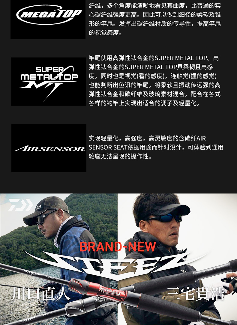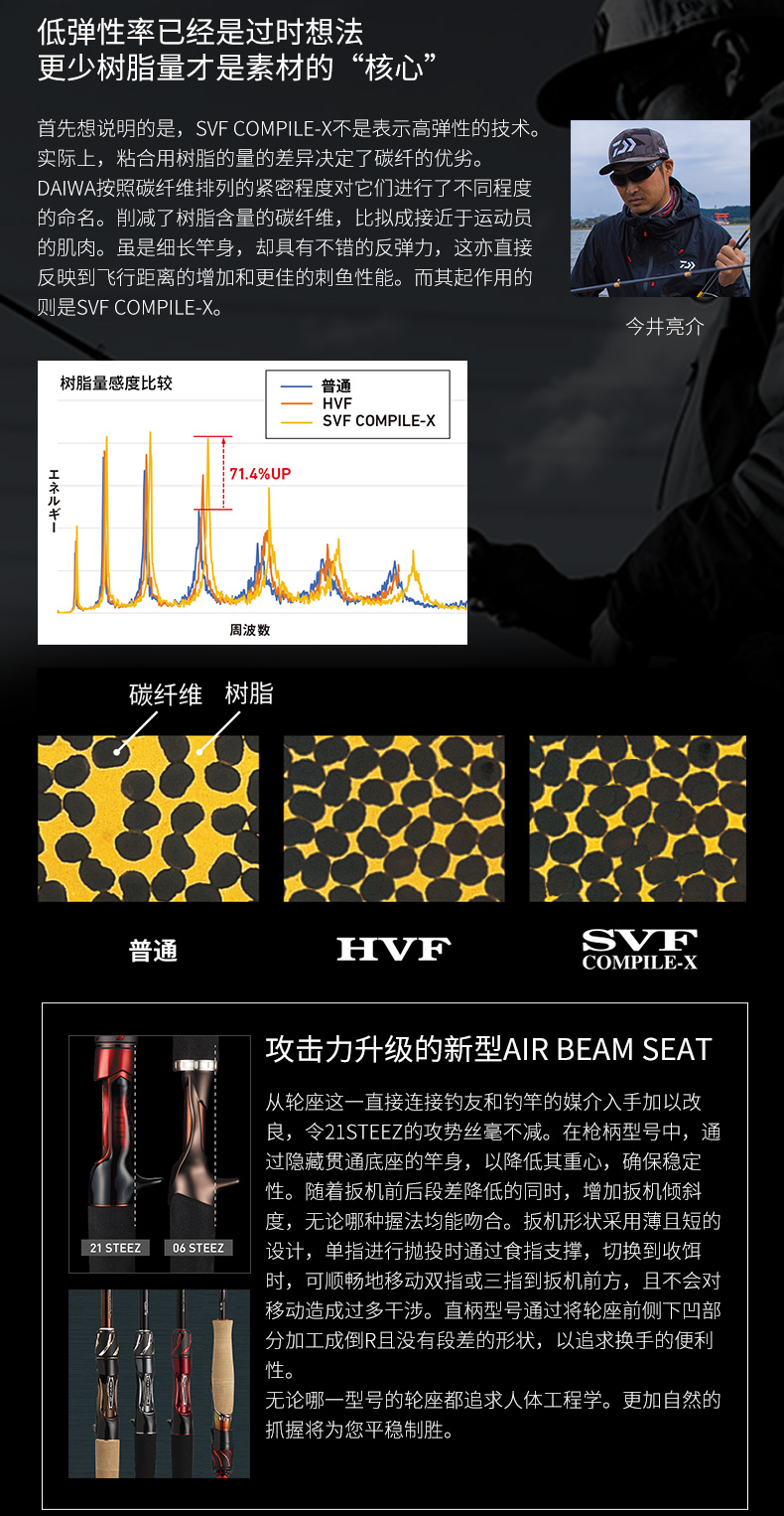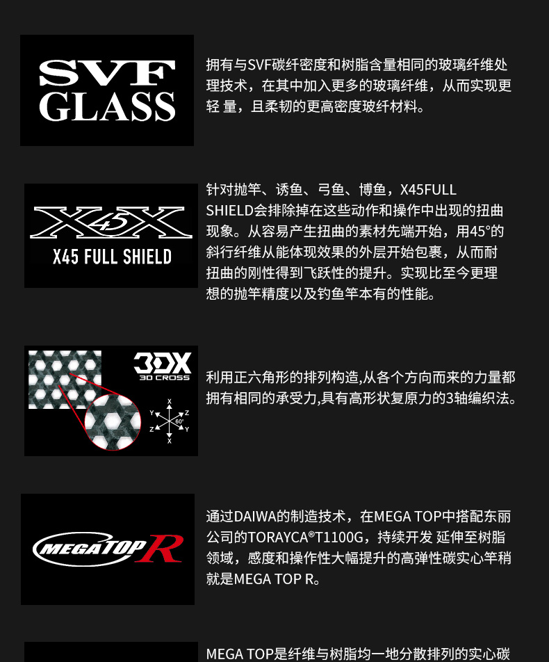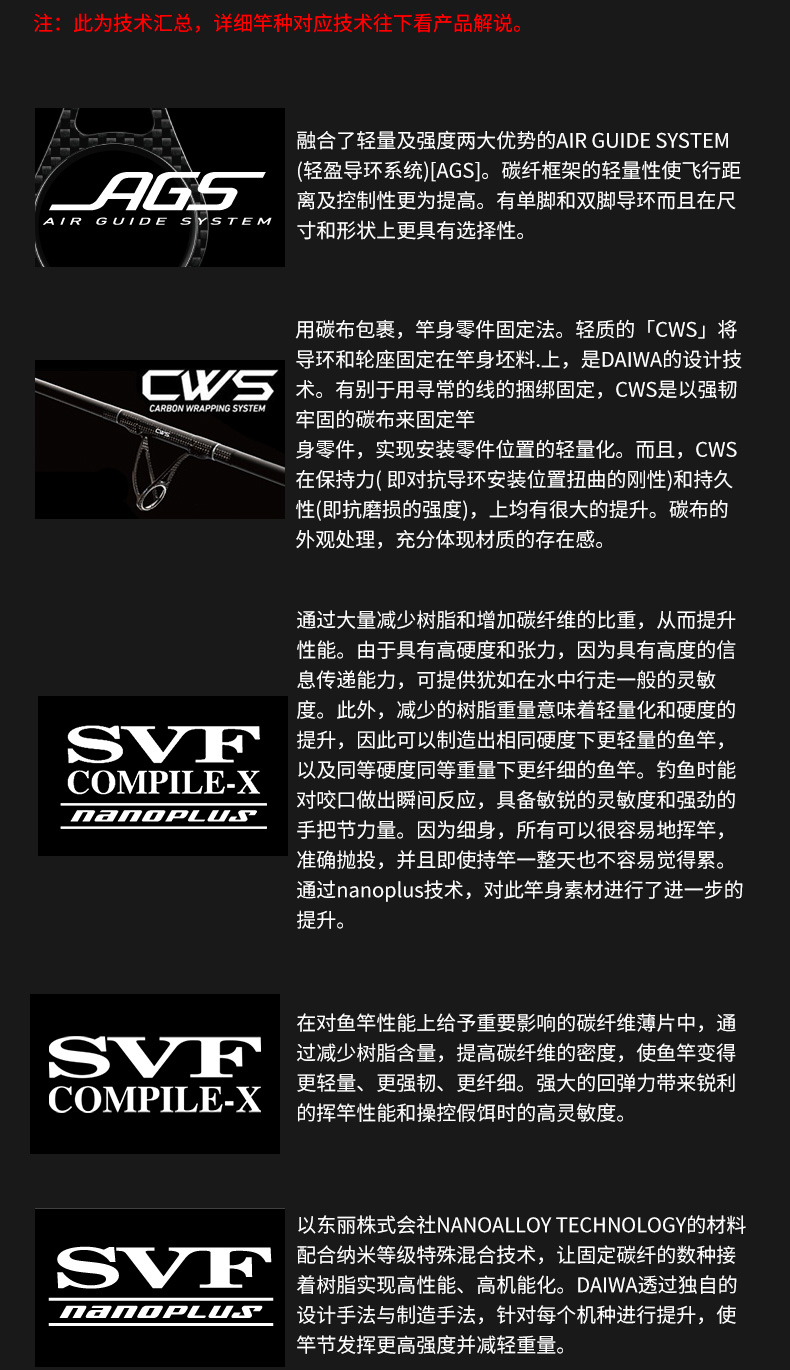 以东丽株式会社NANOALLOY TECHNOLOGY的材料配合奈米等级混合技术,让固定碳纤的数种接着树脂具备更高的性能与更功能。DAIWA透过自身的设计手法与制造手法,针对每个机种进行优化,使竿节发挥更高强度并减轻重量。