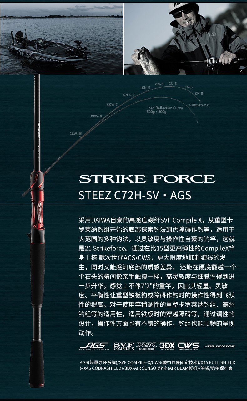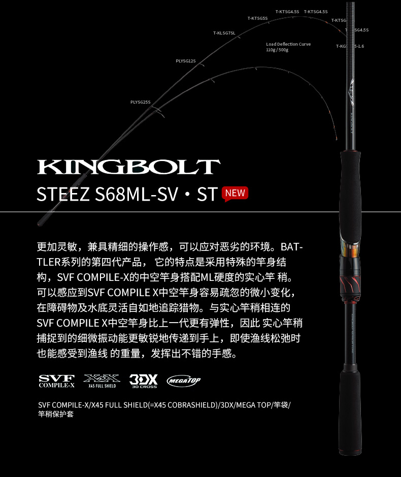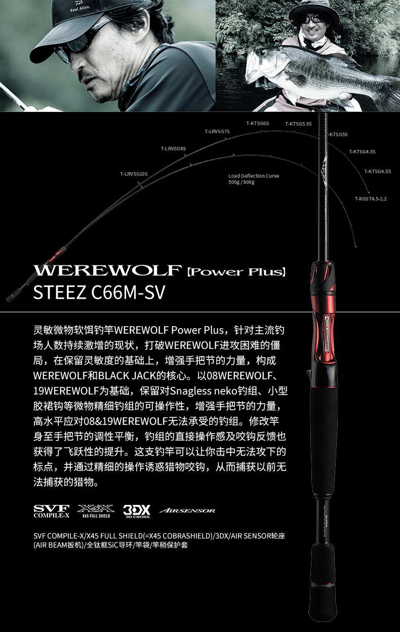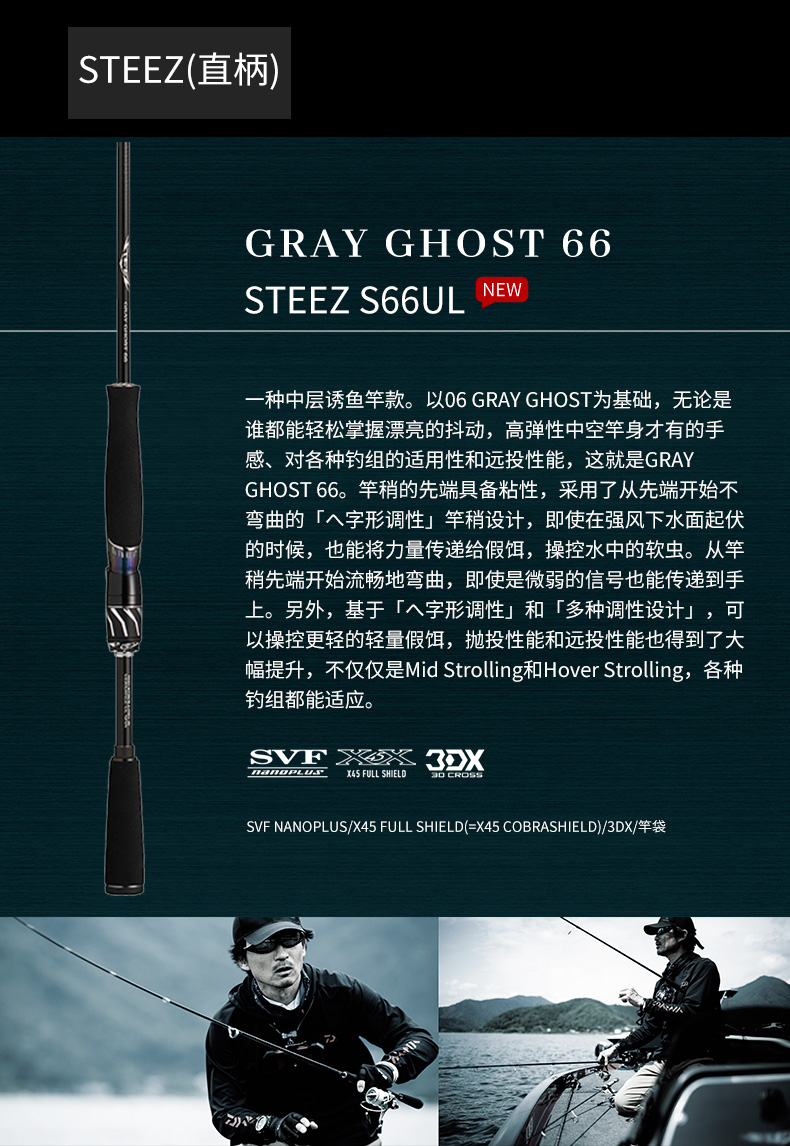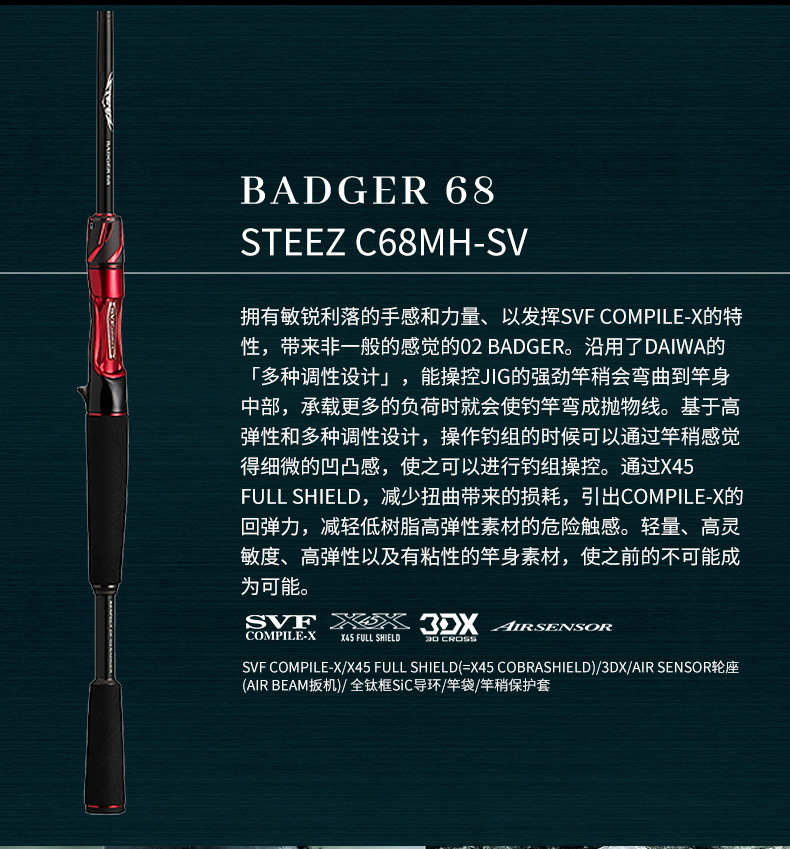 X45:扭转[45°]适合具有强度、操控性的很好的构造设计。在以往的构造上(对竿身0°、90°)包覆着DAIWA的BIAS CROSS(+-45°的斜行碳纤维等)不但能防止扭曲现象,使力量、操作性、灵敏度都得以提升。 X45 FULL SHIELD:针对抛竿、诱鱼、弓鱼、博鱼,X45 FULL SHIELD会排除掉在这些动作和操作中出现的扭曲现象。从容易产生扭曲的素材先端开始,用45°的斜行纤维从能体现效果的外层开始包裹,从而耐扭曲的刚性得到了很大的提升。