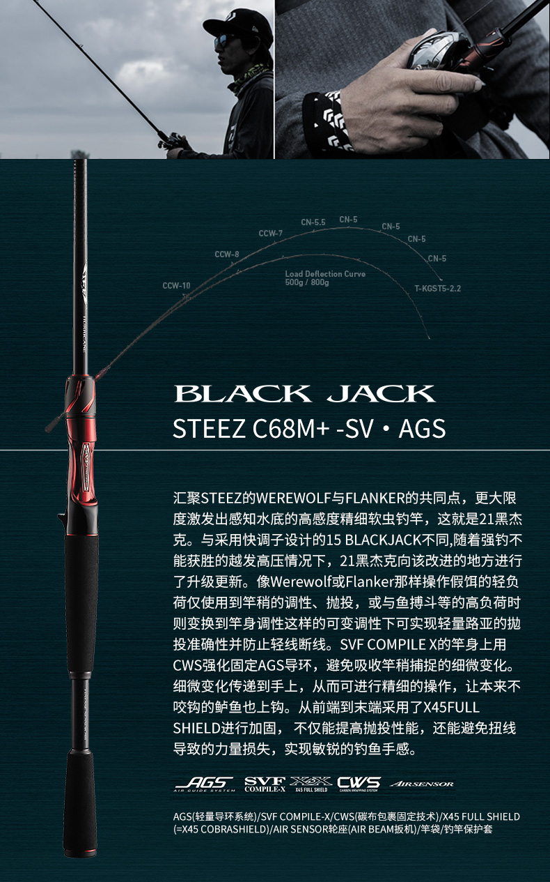 融合了轻量及强度的AIR GUIDE SYSTEM(轻盈导环系统)[AGS]。碳纤框架的轻量性使飞距离及控制性更为提高。碳纤维具有比钛合金高的高刚性,其高刚性通过鱼线即使有微少的信号也能把信号传达到竿尾的高感应度。有单脚和双脚导环而且在尺寸和形状上更具有选择性。