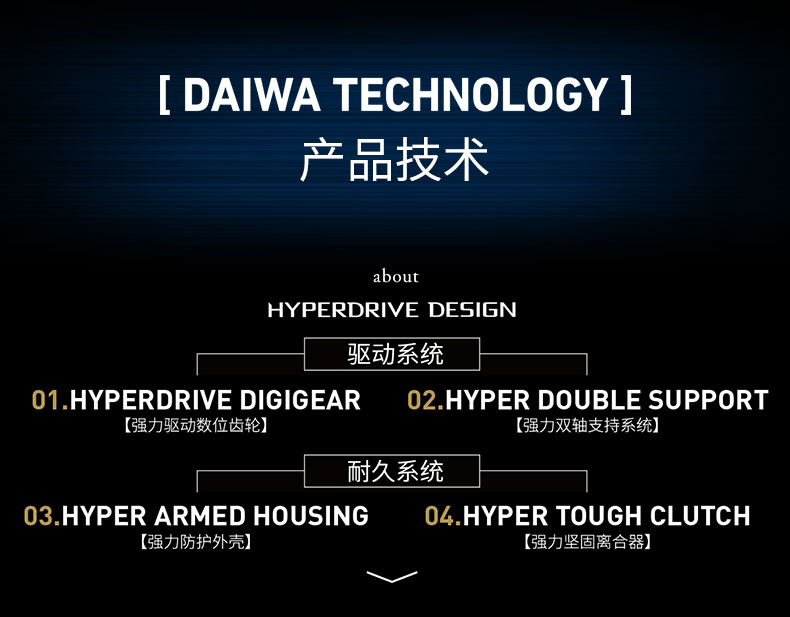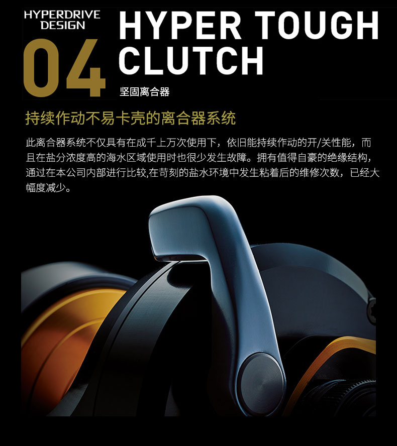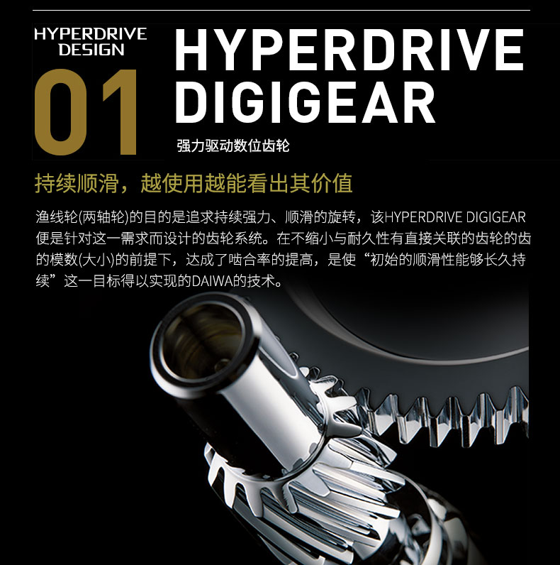 渔线轮(两轴轮)的全新齿轮系统设计,旨在追求持续强力且顺滑的回转。DAIWA独有的技术在不缩小直接影响耐久性的齿轮模数(大小)的前提下,实现啮合率的提高,保障初期的顺滑性能够长久持续。