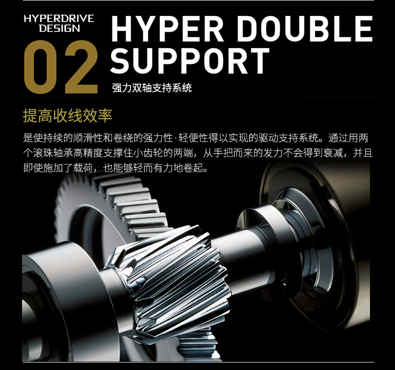 实现持续顺滑性及轻盈有力收线的驱动支持系统。采用两个滚珠轴承高精密支撑小齿轮的两端,从手把布来的发力不会得到衰减,即使在施加载荷时也能轻而有力地收线。