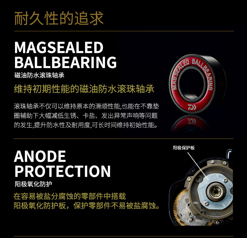 凭借带有磁性的液体薄膜,能有效抑制水和异物入侵滚珠轴承内部,在保有滚珠轴承基本性能的同时,还能大幅减少生锈、海盐附着、异响等的发生。在SALTIGA IC等海钓轮的小齿轮部,以及机身侧盖(齿轮侧)上,通过针对性地采用磁油防水滚珠轴承,更加有效避免了盐分入侵导致的生锈问题。使渔轮发挥出更持久的初期性能。