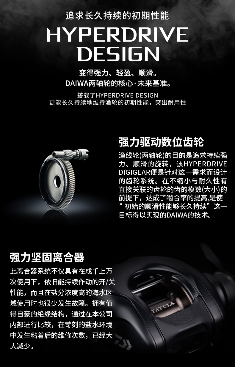 渔线轮(两轴轮)的全新齿轮系统设计,旨在追求持续强力且顺滑的回转。DAIWA独有的技术在不缩小直接影响耐久性的齿轮模数(大小)的前提下,实现啮合率的提高,保障初期的顺滑性能够长久持续。