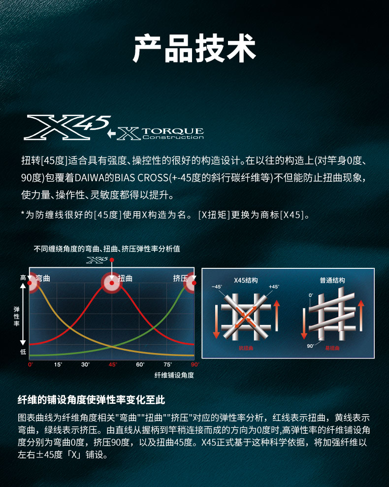 X45:扭转[45°]适合具有强度、操控性的很好的构造设计。在以往的构造上(对竿身0°、90°)包覆着DAIWA的BIAS CROSS(+-45°的斜行碳纤维等)不但能防止扭曲现象,使力量、操作性、灵敏度都得以提升。 X45 FULL SHIELD:针对抛竿、诱鱼、弓鱼、博鱼,X45 FULL SHIELD会排除掉在这些动作和操作中出现的扭曲现象。从容易产生扭曲的素材先端开始,用45°的斜行纤维从能体现效果的外层开始包裹,从而耐扭曲的刚性得到了很大的提升。