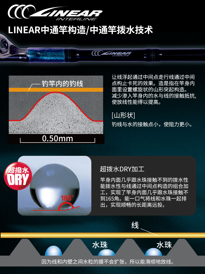 让线浮起通过中间点走行线通过中间点构止卡死的效果。造是指在竿身内面里设置螺旋状的山形突起构造。减少渗入竿身内的水与线的接触抵抗,使放线性能得以提高。