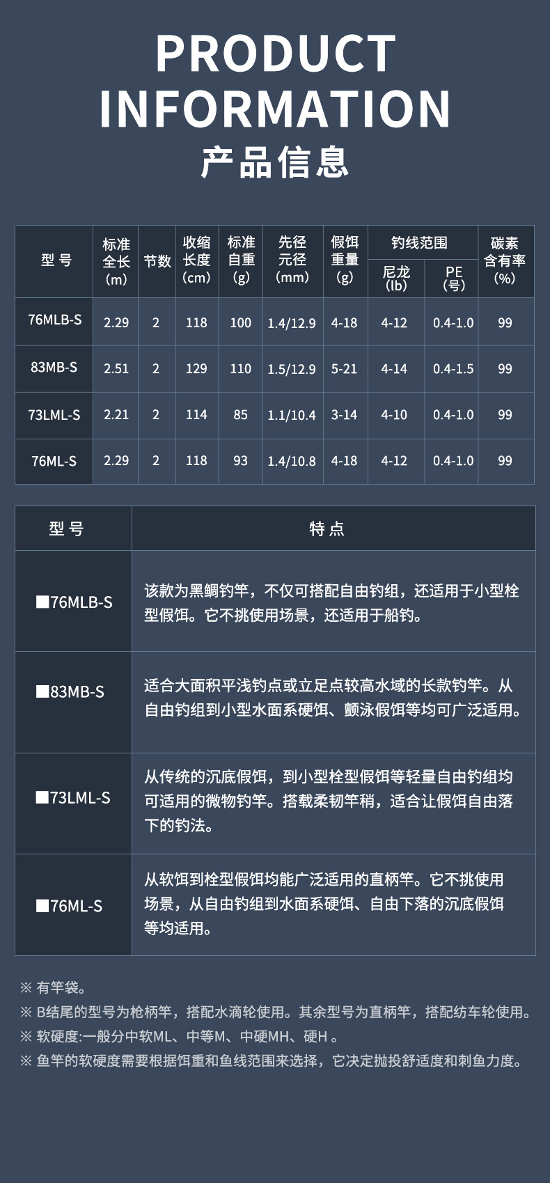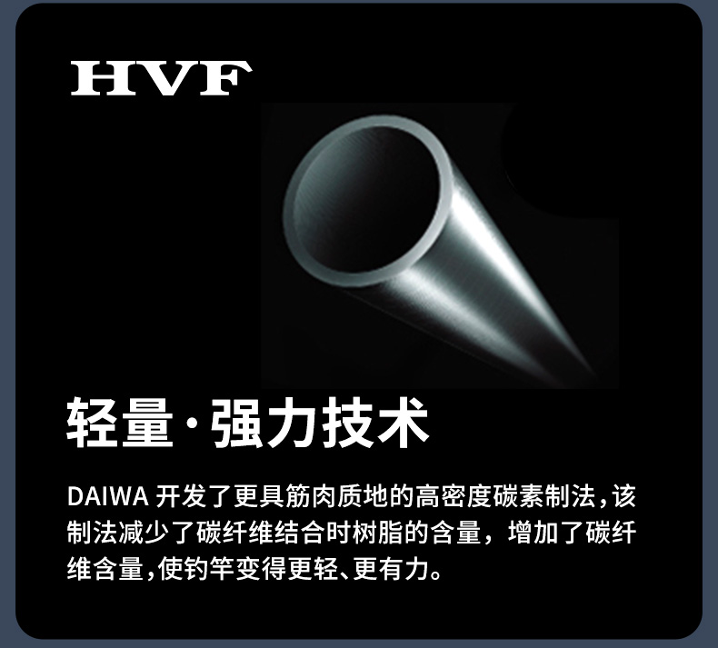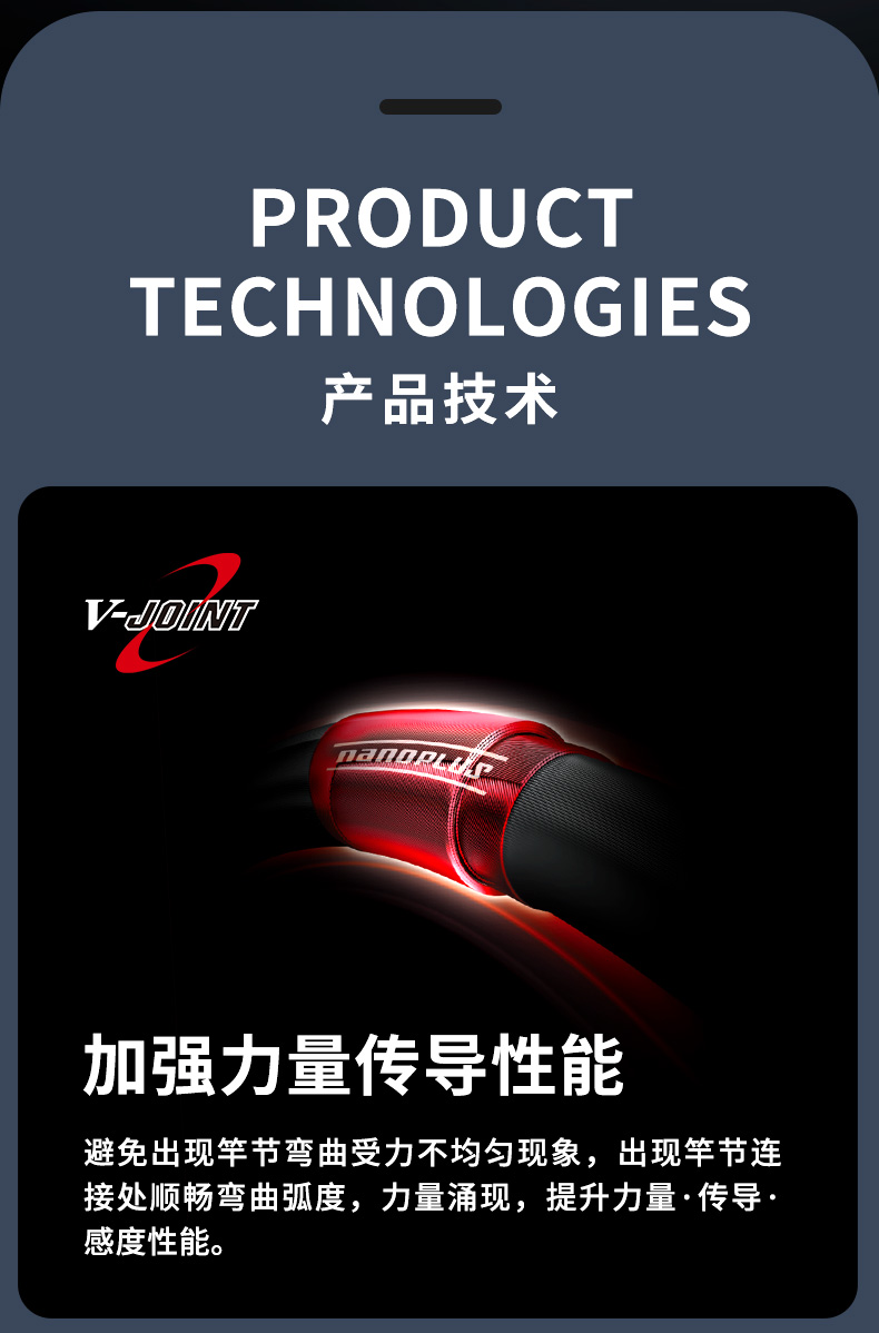 V-JOINT:具线条美感弧度能达到理想的状态及发挥更高威力。在竿节的部位使用DAIWA自身的BIAS构造。实现结合部的理想弧度,同时提高力量/传导/感度性能。 V-JOINTα:使用含nano+的高强度材质及DAIWA自身高精准度钓竿设计制造技术, 使V-JOINT更加强韧、轻盈、美观。