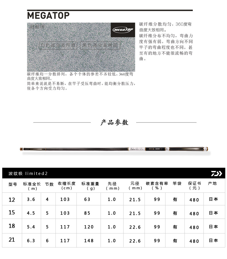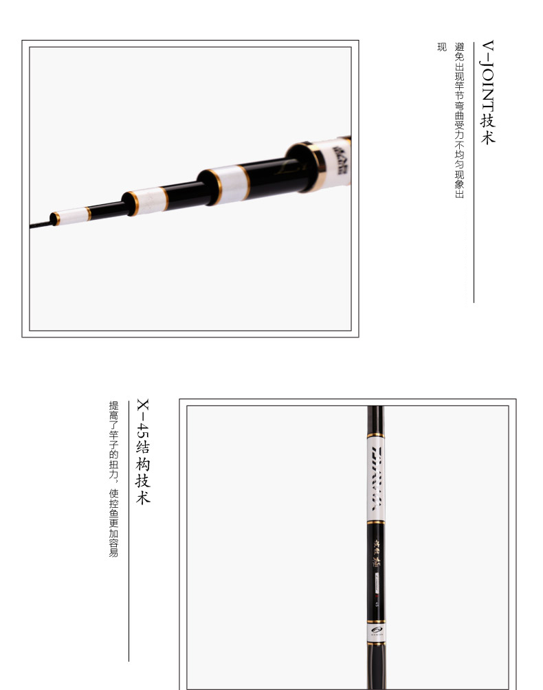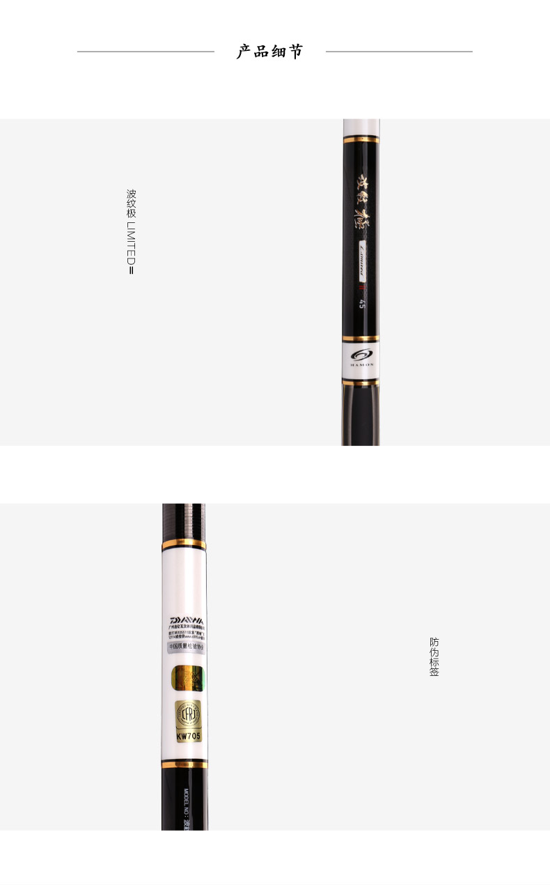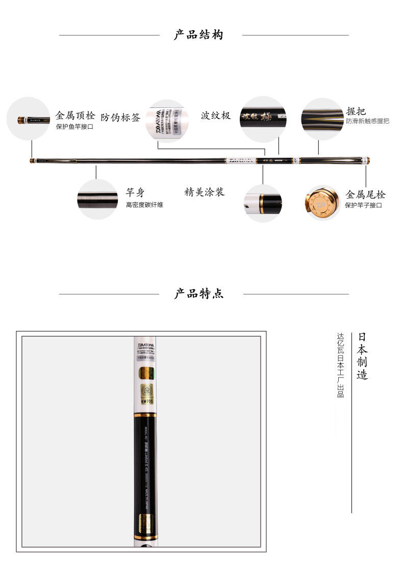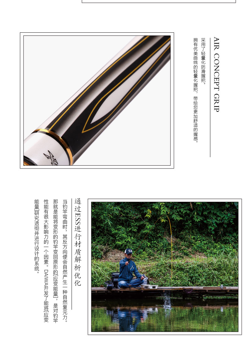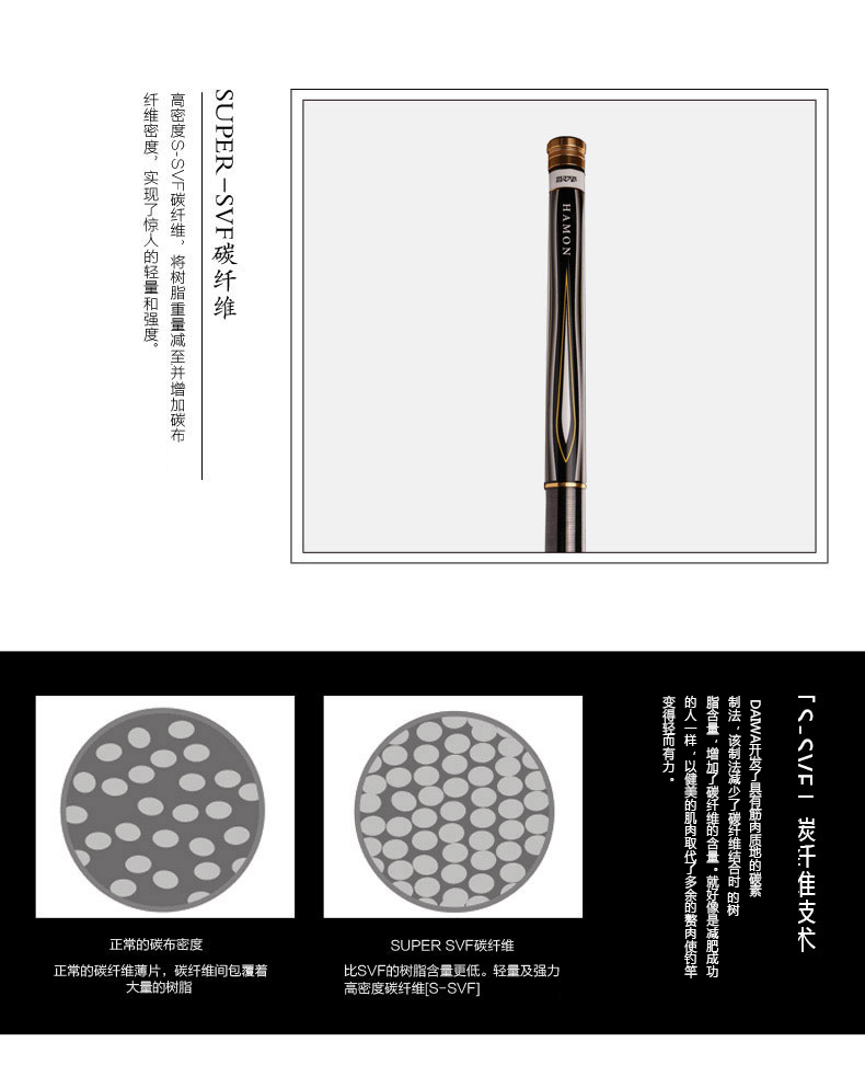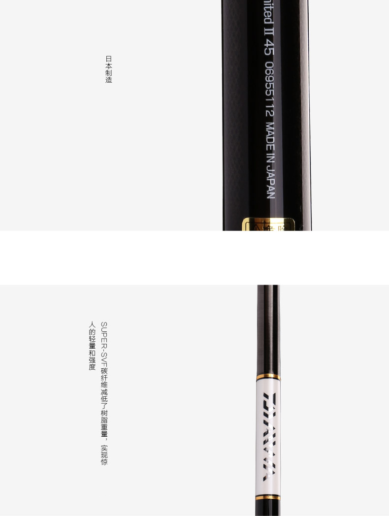 V-JOINT:具线条美感弧度能达到理想的状态及发挥更高威力。在竿节的部位使用DAIWA自身的BIAS构造。实现结合部的理想弧度,同时提高力量/传导/感度性能。 V-JOINTα:使用含nano+的高强度材质及DAIWA自身高精准度钓竿设计制造技术, 使V-JOINT更加强韧、轻盈、美观。