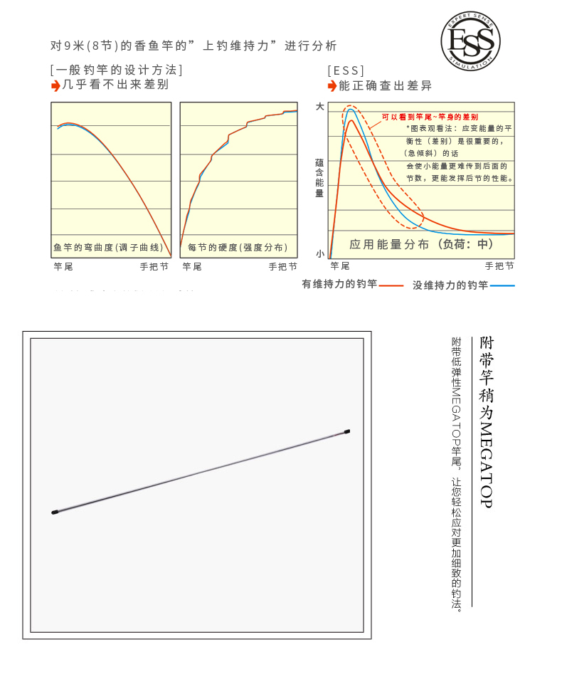 当钓竿弯曲时,其反方向便会自然产生一种自然复元力。那就是能将变形的钓竿变回原形的「应变能量」是对钓竿性能有很大影响力的一个因素.DAIWA开发了能将「应变能量」透彻分析并进行设计的系统。不仅能明确地显示出“那个部分好”“那个部分不足”,还能把感度领域也能在钓竿上显现出来,制作出理想的钓竿,改变性的钓竿“ESS”设计系统。