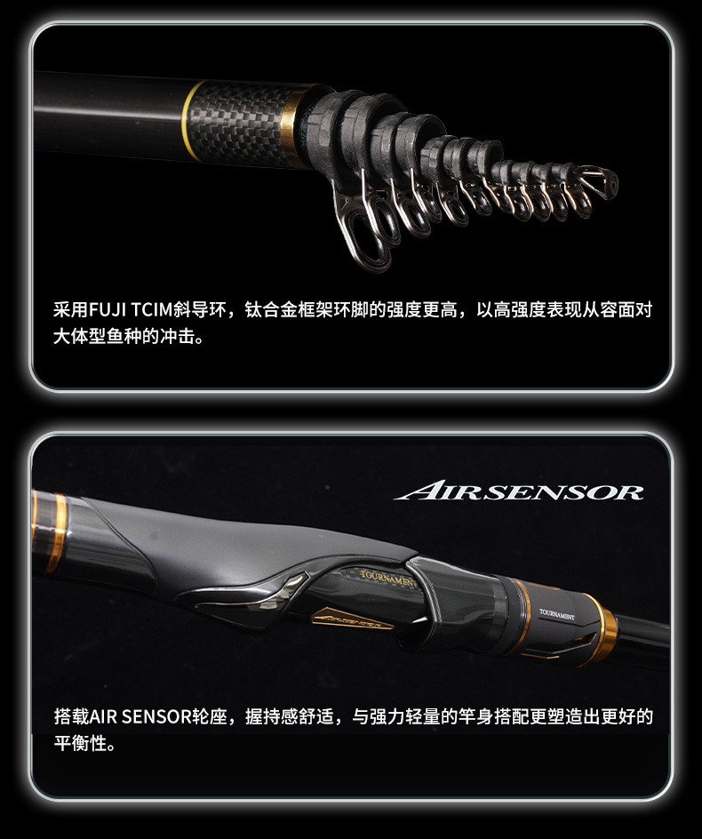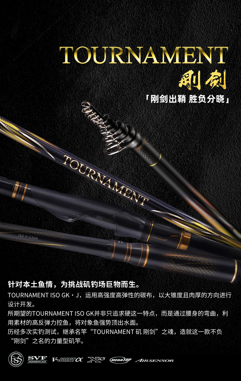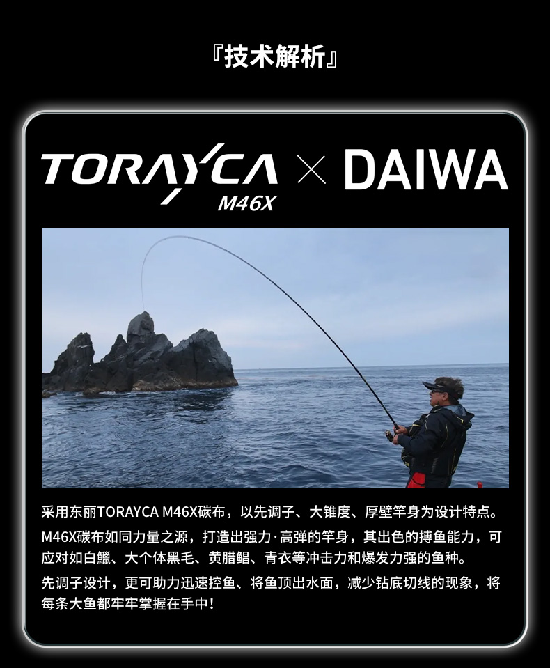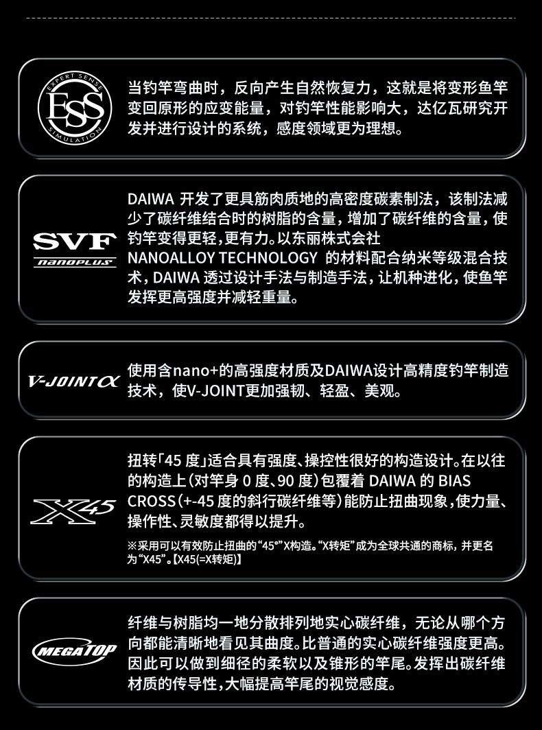 V-JOINT:具线条美感弧度能达到理想的状态及发挥更高威力。在竿节的部位使用DAIWA自身的BIAS构造。实现结合部的理想弧度,同时提高力量/传导/感度性能。 V-JOINTα:使用含nano+的高强度材质及DAIWA自身高精准度钓竿设计制造技术, 使V-JOINT更加强韧、轻盈、美观。