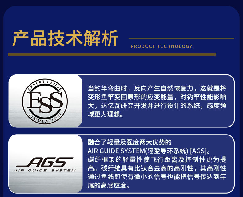 当钓竿弯曲时,其反方向便会自然产生一种自然复元力。那就是能将变形的钓竿变回原形的「应变能量」是对钓竿性能有很大影响力的一个因素.DAIWA开发了能将「应变能量」透彻分析并进行设计的系统。不仅能明确地显示出“那个部分好”“那个部分不足”,还能把感度领域也能在钓竿上显现出来,制作出理想的钓竿,改变性的钓竿“ESS”设计系统。