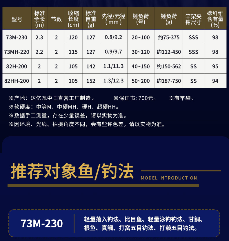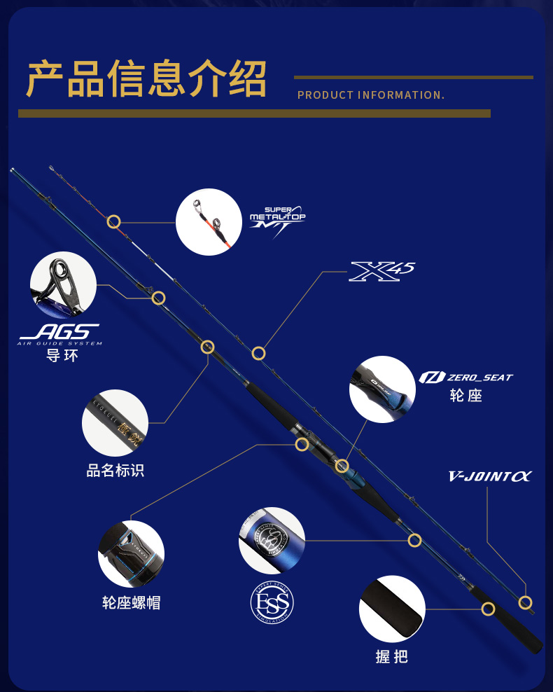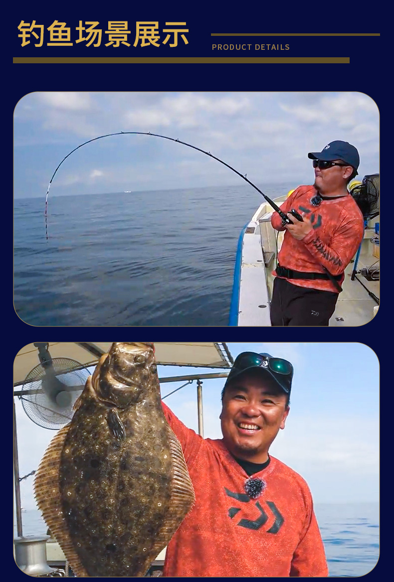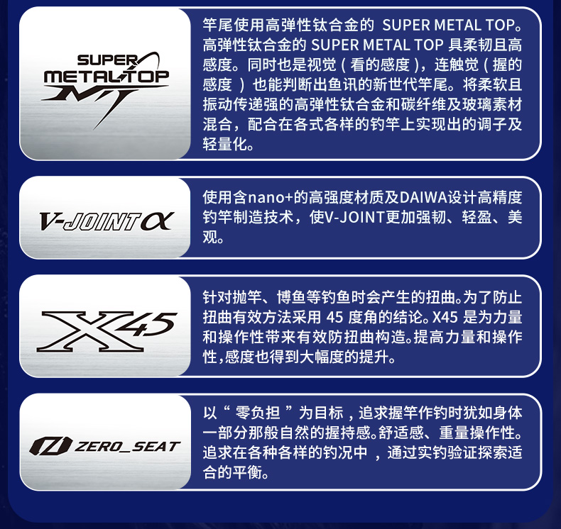 V-JOINT:具线条美感弧度能达到理想的状态及发挥更高威力。在竿节的部位使用DAIWA自身的BIAS构造。实现结合部的理想弧度,同时提高力量/传导/感度性能。 V-JOINTα:使用含nano+的高强度材质及DAIWA自身高精准度钓竿设计制造技术, 使V-JOINT更加强韧、轻盈、美观。