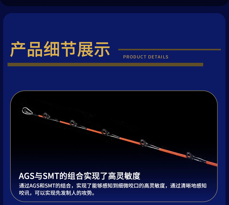 融合了轻量及强度的AIR GUIDE SYSTEM(轻盈导环系统)[AGS]。碳纤框架的轻量性使飞距离及控制性更为提高。碳纤维具有比钛合金高的高刚性,其高刚性通过鱼线即使有微少的信号也能把信号传达到竿尾的高感应度。有单脚和双脚导环而且在尺寸和形状上更具有选择性。
