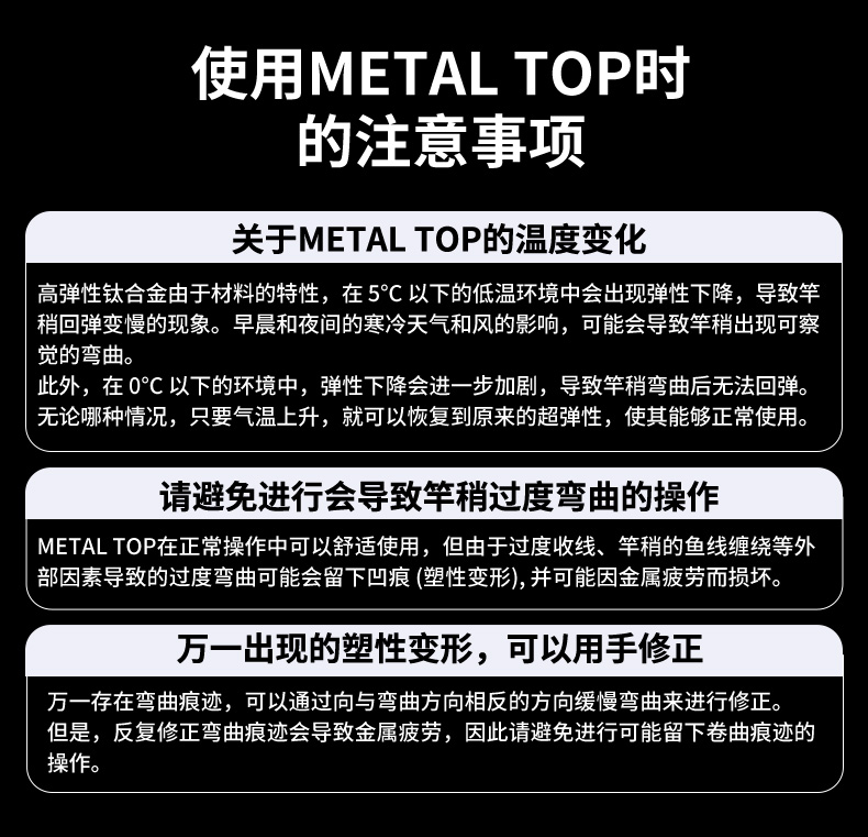 竿尾使用高弹性钛合金的SUPER METAL TOP。高弹性钛合金的SUPER METAL TOP具柔韧且高感度。同时也是视觉(看的感度),连触觉(握的感度),也能判断出鱼讯的新世代竿尾。将柔软且振动传递强的高弹性钛合金和碳纤维及玻璃素材混合,配合在各式各样的钓竿上实现出适合的调子及轻量化。