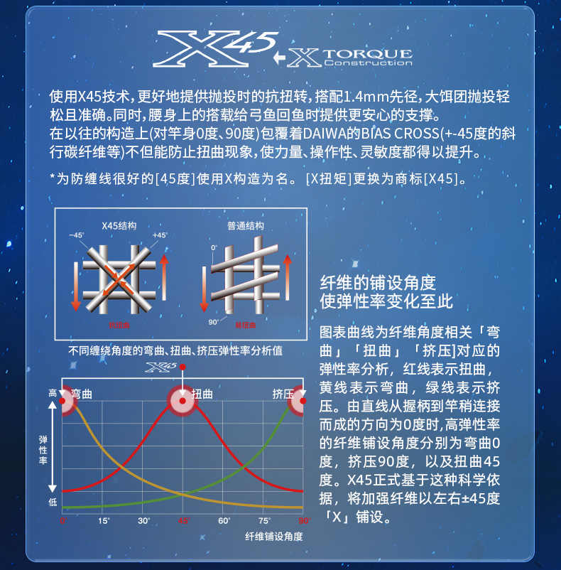 X45:扭转[45°]适合具有强度、操控性的很好的构造设计。在以往的构造上(对竿身0°、90°)包覆着DAIWA的BIAS CROSS(+-45°的斜行碳纤维等)不但能防止扭曲现象,使力量、操作性、灵敏度都得以提升。 X45 FULL SHIELD:针对抛竿、诱鱼、弓鱼、博鱼,X45 FULL SHIELD会排除掉在这些动作和操作中出现的扭曲现象。从容易产生扭曲的素材先端开始,用45°的斜行纤维从能体现效果的外层开始包裹,从而耐扭曲的刚性得到了很大的提升。