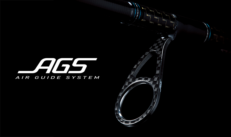 融合了轻量及强度的AIR GUIDE SYSTEM(轻盈导环系统)[AGS]。碳纤框架的轻量性使飞距离及控制性更为提高。碳纤维具有比钛合金高的高刚性,其高刚性通过鱼线即使有微少的信号也能把信号传达到竿尾的高感应度。有单脚和双脚导环而且在尺寸和形状上更具有选择性。