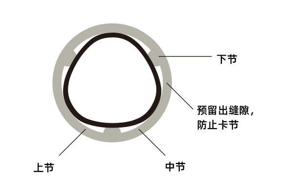 为了防止卡节的情形发生,在接合部位上加工做出浅沟( 环状)缝隙空气层,以节的宽度来改变环状数量构造。
