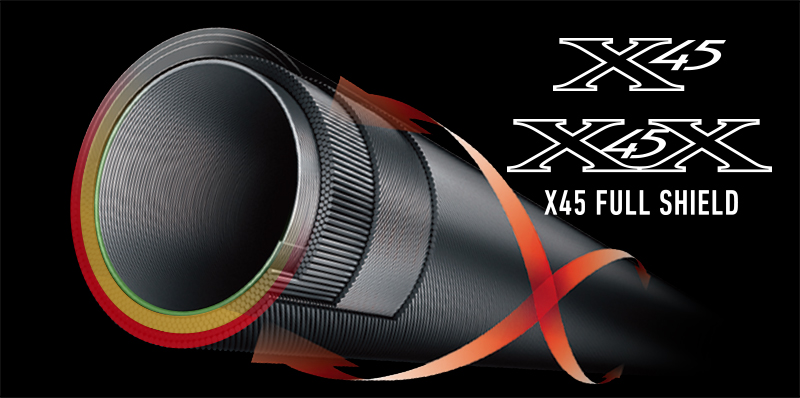X45:扭转[45°]适合具有强度、操控性的很好的构造设计。在以往的构造上(对竿身0°、90°)包覆着DAIWA的BIAS CROSS(+-45°的斜行碳纤维等)不但能防止扭曲现象,使力量、操作性、灵敏度都得以提升。 X45 FULL SHIELD:针对抛竿、诱鱼、弓鱼、博鱼,X45 FULL SHIELD会排除掉在这些动作和操作中出现的扭曲现象。从容易产生扭曲的素材先端开始,用45°的斜行纤维从能体现效果的外层开始包裹,从而耐扭曲的刚性得到了很大的提升。