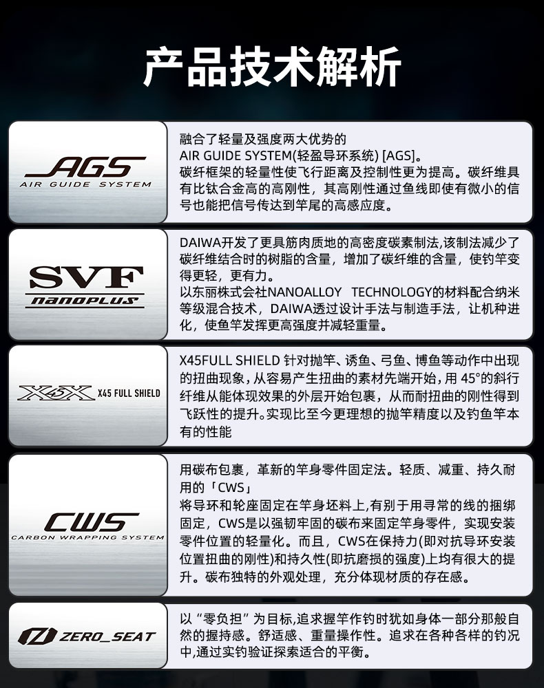 以东丽株式会社NANOALLOY TECHNOLOGY的材料配合奈米等级混合技术,让固定碳纤的数种接着树脂具备更高的性能与更功能。DAIWA透过自身的设计手法与制造手法,针对每个机种进行优化,使竿节发挥更高强度并减轻重量。