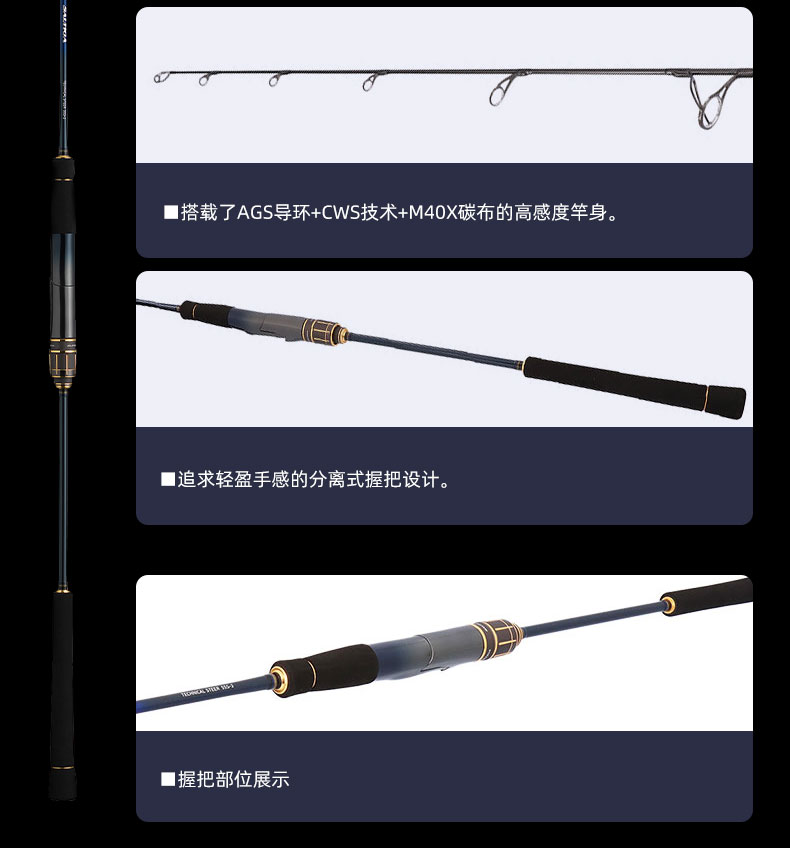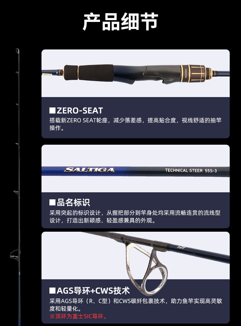 将导环和轮座固定在竿身坯料上,是DAIWA自创的技术。有别于用寻常的线捆绑固定,CWS是以强韧牢固的碳布来固定零件,实现安装零件位置的轻量化。而且,CWS在保持力(即对抗导环安装位置扭曲的刚性)和持久性(即抗磨损的强度)上均有很大的提升。碳布的外观处理,充分体现材质的存在感。