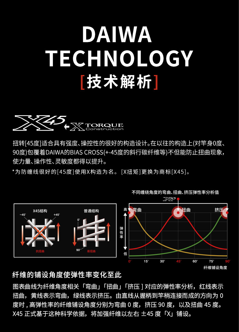 X45:扭转[45°]适合具有强度、操控性的很好的构造设计。在以往的构造上(对竿身0°、90°)包覆着DAIWA的BIAS CROSS(+-45°的斜行碳纤维等)不但能防止扭曲现象,使力量、操作性、灵敏度都得以提升。 X45 FULL SHIELD:针对抛竿、诱鱼、弓鱼、博鱼,X45 FULL SHIELD会排除掉在这些动作和操作中出现的扭曲现象。从容易产生扭曲的素材先端开始,用45°的斜行纤维从能体现效果的外层开始包裹,从而耐扭曲的刚性得到了很大的提升。