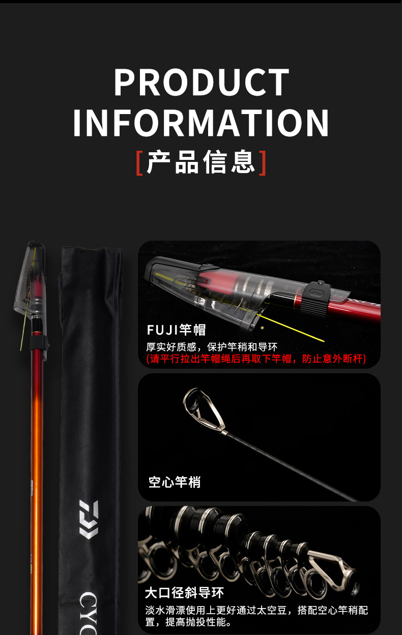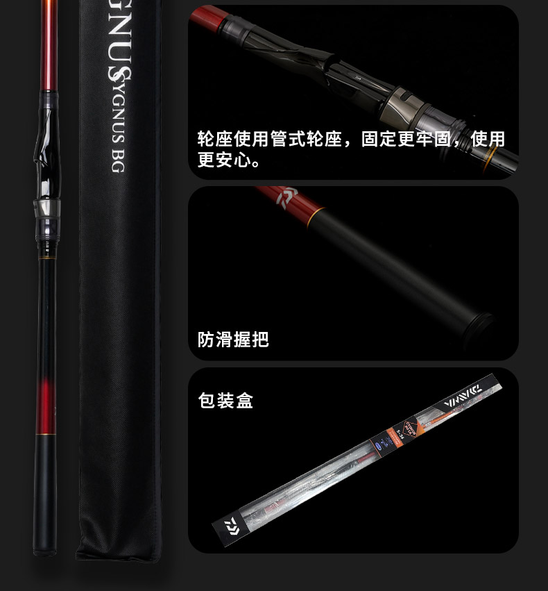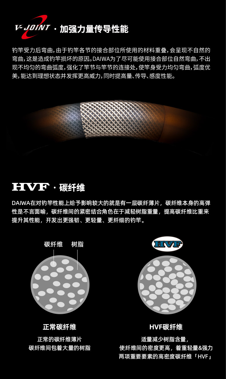 V-JOINT:具线条美感弧度能达到理想的状态及发挥更高威力。在竿节的部位使用DAIWA自身的BIAS构造。实现结合部的理想弧度,同时提高力量/传导/感度性能。 V-JOINTα:使用含nano+的高强度材质及DAIWA自身高精准度钓竿设计制造技术, 使V-JOINT更加强韧、轻盈、美观。